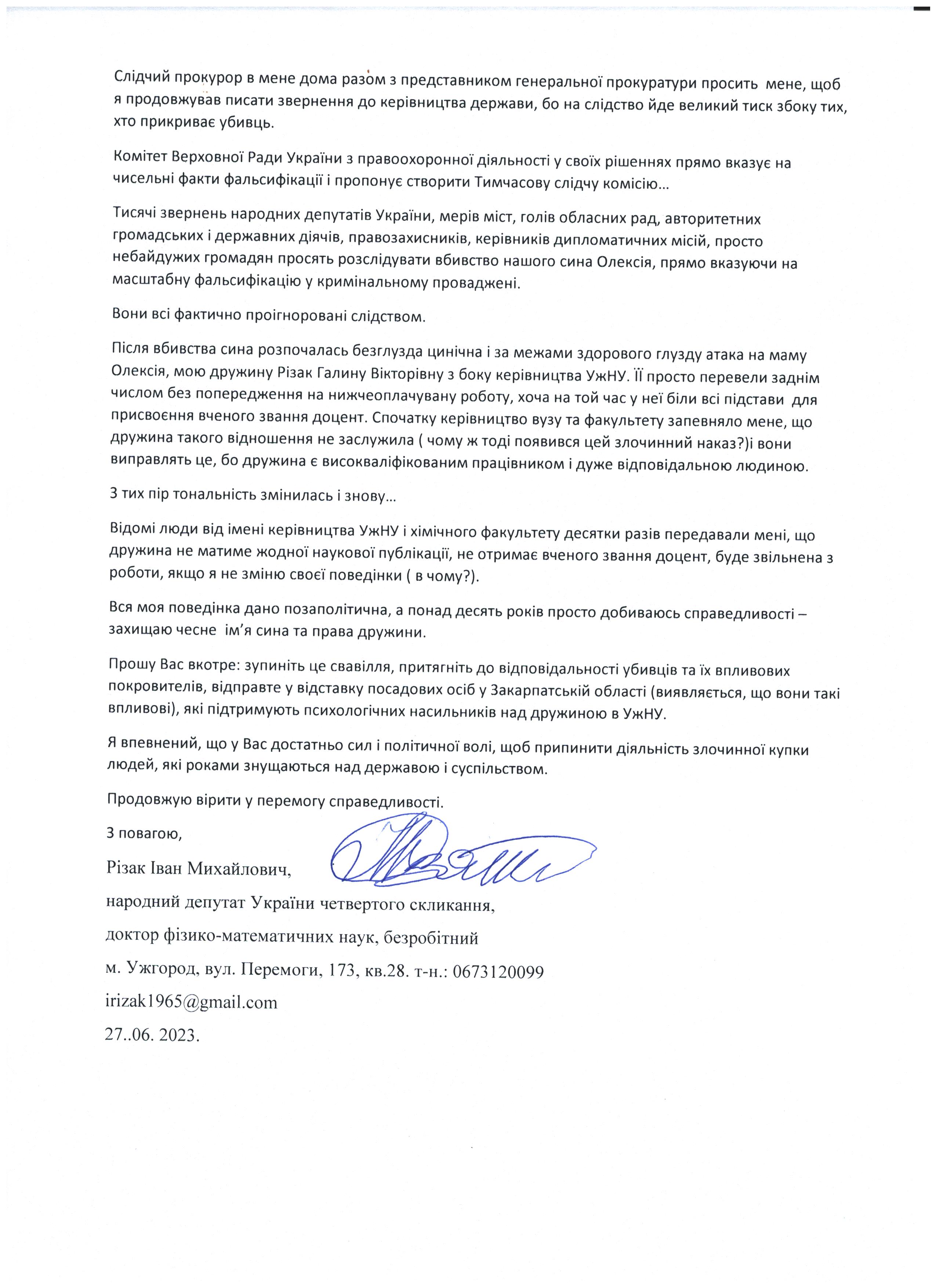 Це дає мені підстави говорити про те, що вбивство мого сина – чітко спланована спецоперація з відповідним інформаційним забезпеченням по своїм масштабам схожа на гебельсівську пропаганду. На час поширення цієї версії загибелі сина не було жодної, підкреслюю жодної, підстави говорити про самогубство, оскільки на той час слідчі не знайшли і сліду падіння з багатоповерхівки Олексія Різака, а також не провели жодної слідчої дії з громадянкою із-за «нещасливої» любові до якої мій син закінчив життя самогубством. Щиро прошу Вас, в найближчі години перекваліфікувати цю трагедію за статею КПК «вбивство» і всебічно, об’єктивно та системно провести відповідні слідчі дії для знаходження впливових замовників і звірів-вбивць мого рідного сина. Коротко Вас проінформую, що Різак Олексій Іванович, 1989 р.н., магістр фінансів (закінчив економічний факультет Харківського національного університету імені В.Н. Каразіна з відзнакою), магістр – юрист (закінчив магістратуру національного університету «Юридична академія України імені Ярослава Мудрого»), має військове звання – молодший лейтенант запасу, працював головним державним податковим інспектором першого рангу ДПС у Закарпатській області. Активно займався спортом. У свій час виступав за юнацьку збірну України з футболу, професійний клуб ФК «Закарпаття». На сьогоднішній день виступав за збірну ДПС у Закарпатській області, щоденно займався фізкультурою (для прикладу скажу, щоранку віджимався до 500 разів, а кількість ранкових стрибків на скакалці сягала 2000 разів, разом зі мною освоював східні єдиноборства), мав щирі відносини із дівчиною, колегами по роботі, був серйозним і відповідальним фахівцем. Додам також, що за півтори години до знаходження його тіла я спілкувався з ним особисто по телефону і обговорював подробиці матчу чемпіонату Італії з футболу Мілан – Фіорентина, під час цієї розмови ми обговорили майбутню поїздку у Київ, а також похід у гості до знайомих. Переконаний, нічого не могло статися за ці півтори години після нашої доброї розмови з почуттям гумору і присутності його дівчини, якій я передав вітання.