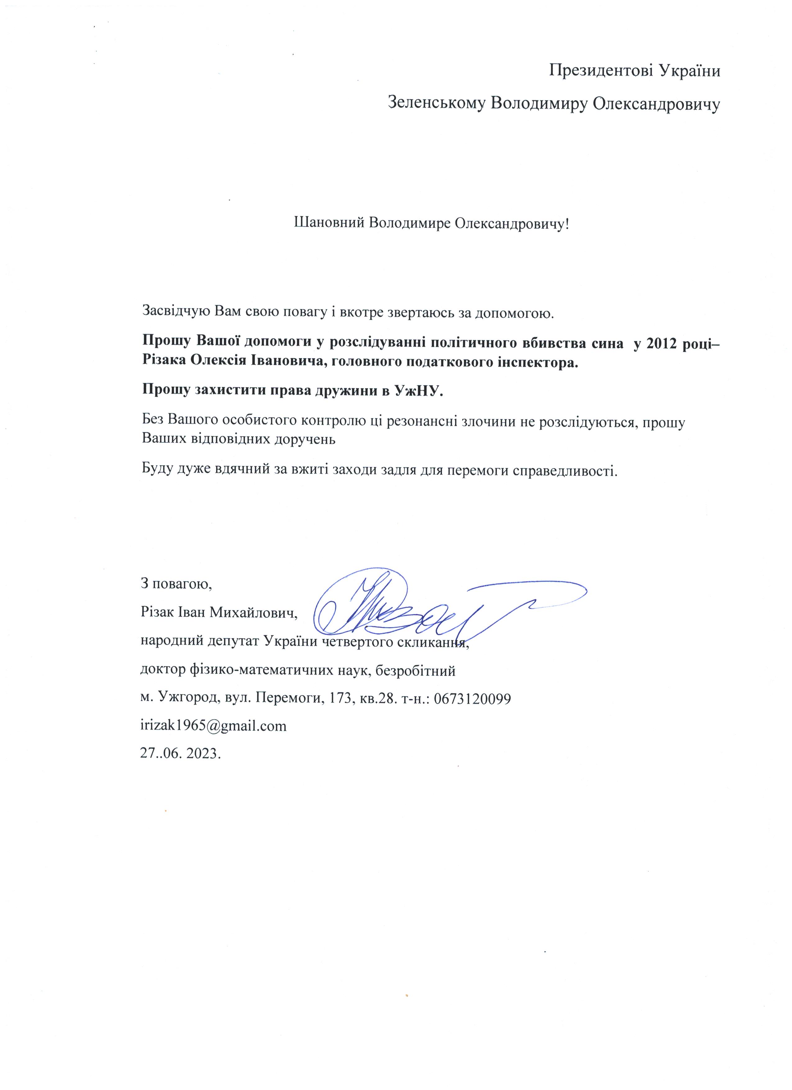 Шановні Анатолію Леонідовичу, Василю Дмитровичу, Василю Миколайовичу! Звертаюся до Вас як батько, як колишній керівник області, як простий житель цього краю, який хоче, щоб на цій землі ніколи не проливалася кров наших рідних, знайомих і близьких. Переконаний, що у політичного керівництва держави є достатньо волі для того, щоб поставити на місце «безпредельщиков», які пробують дестабілізувати ситуацію у державі. Переконаний, що події на кшталт помаранчевого терору у 2005 роців області більше не повторяться. З глибокою повагою, Різак Іван Михайлович, що проживає за адресою м. Ужгород, вул. Капушанська, б.173 кв. 28, голова Закарпатської обласної державної адміністрації (вересень 2002р. – січень 2005р.), народний депутат IV скликання, державний службовець І рангу, багаторічний голова і член координаційного комітету по боротьбі з організованою злочинністю при ОДА, кандидат фізико-математичних наук, тимчасово непрацюючий.