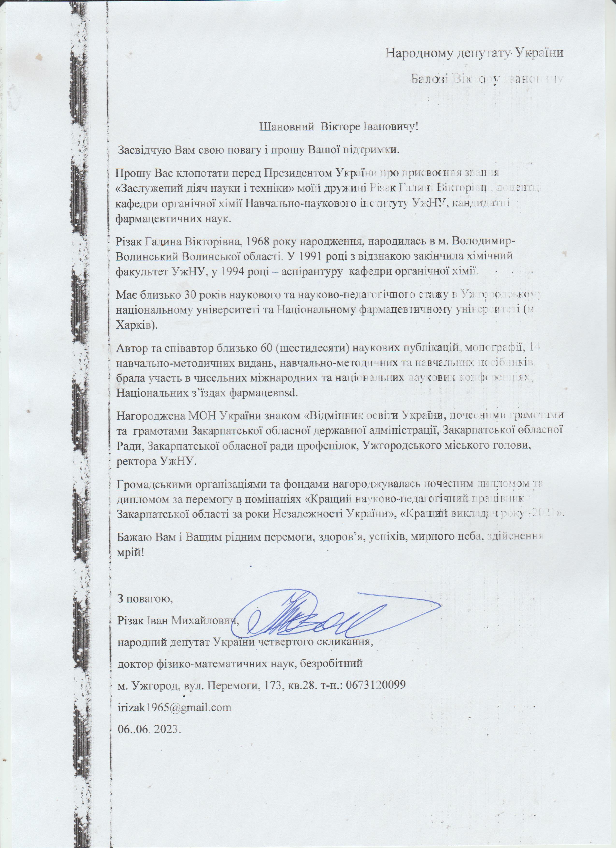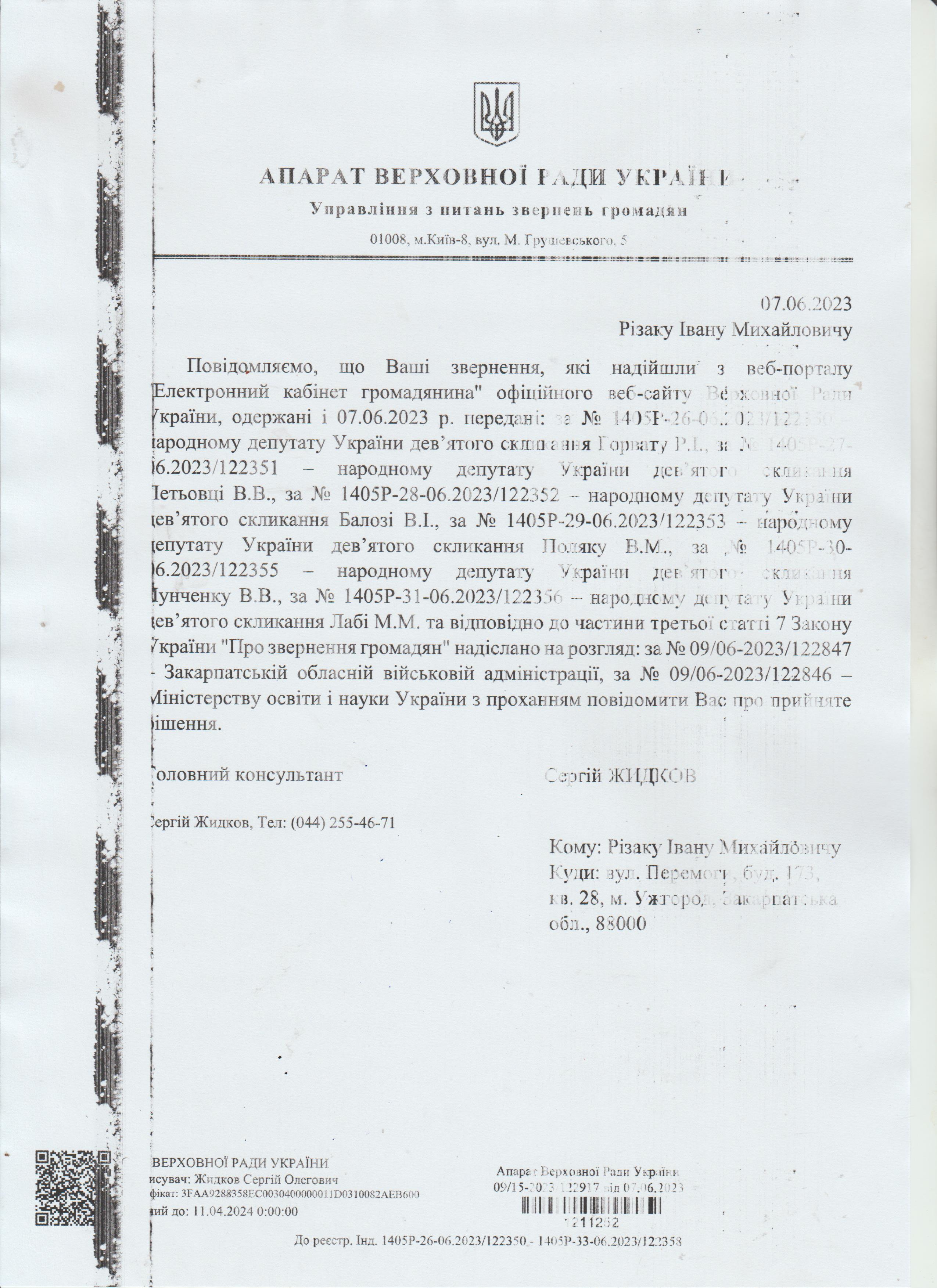 Шановні Анатолію Леонідовичу, Василю Дмитровичу, Василю Миколайовичу! Звертаюся до Вас як батько, як колишній керівник області, як простий житель цього краю, який хоче, щоб на цій землі ніколи не проливалася кров наших рідних, знайомих і близьких. Переконаний, що у політичного керівництва держави є достатньо волі для того, щоб поставити на місце «безпредельщиков», які пробують дестабілізувати ситуацію у державі. Переконаний, що події на кшталт помаранчевого терору у 2005 роців області більше не повторяться. З глибокою повагою, Різак Іван Михайлович, що проживає за адресою м. Ужгород, вул. Капушанська, б.173 кв. 28, голова Закарпатської обласної державної адміністрації (вересень 2002р. – січень 2005р.), народний депутат IV скликання, державний службовець І рангу, багаторічний голова і член координаційного комітету по боротьбі з організованою злочинністю при ОДА, кандидат фізико-математичних наук, тимчасово непрацюючий.