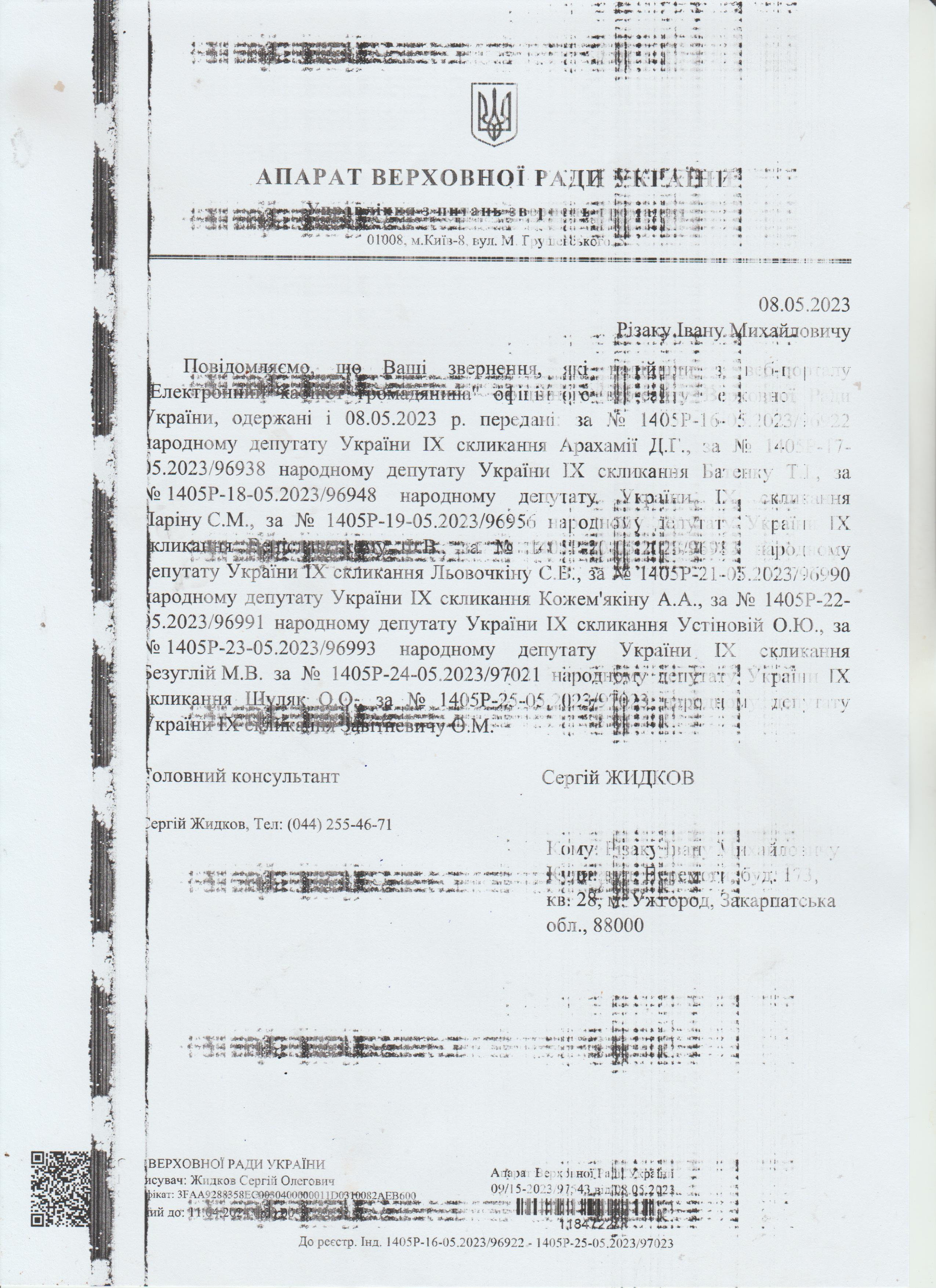 Шановні Анатолію Леонідовичу, Василю Дмитровичу, Василю Миколайовичу! Звертаюся до Вас як батько, як колишній керівник області, як простий житель цього краю, який хоче, щоб на цій землі ніколи не проливалася кров наших рідних, знайомих і близьких. Переконаний, що у політичного керівництва держави є достатньо волі для того, щоб поставити на місце «безпредельщиков», які пробують дестабілізувати ситуацію у державі. Переконаний, що події на кшталт помаранчевого терору у 2005 роців області більше не повторяться. З глибокою повагою, Різак Іван Михайлович, що проживає за адресою м. Ужгород, вул. Капушанська, б.173 кв. 28, голова Закарпатської обласної державної адміністрації (вересень 2002р. – січень 2005р.), народний депутат IV скликання, державний службовець І рангу, багаторічний голова і член координаційного комітету по боротьбі з організованою злочинністю при ОДА, кандидат фізико-математичних наук, тимчасово непрацюючий.