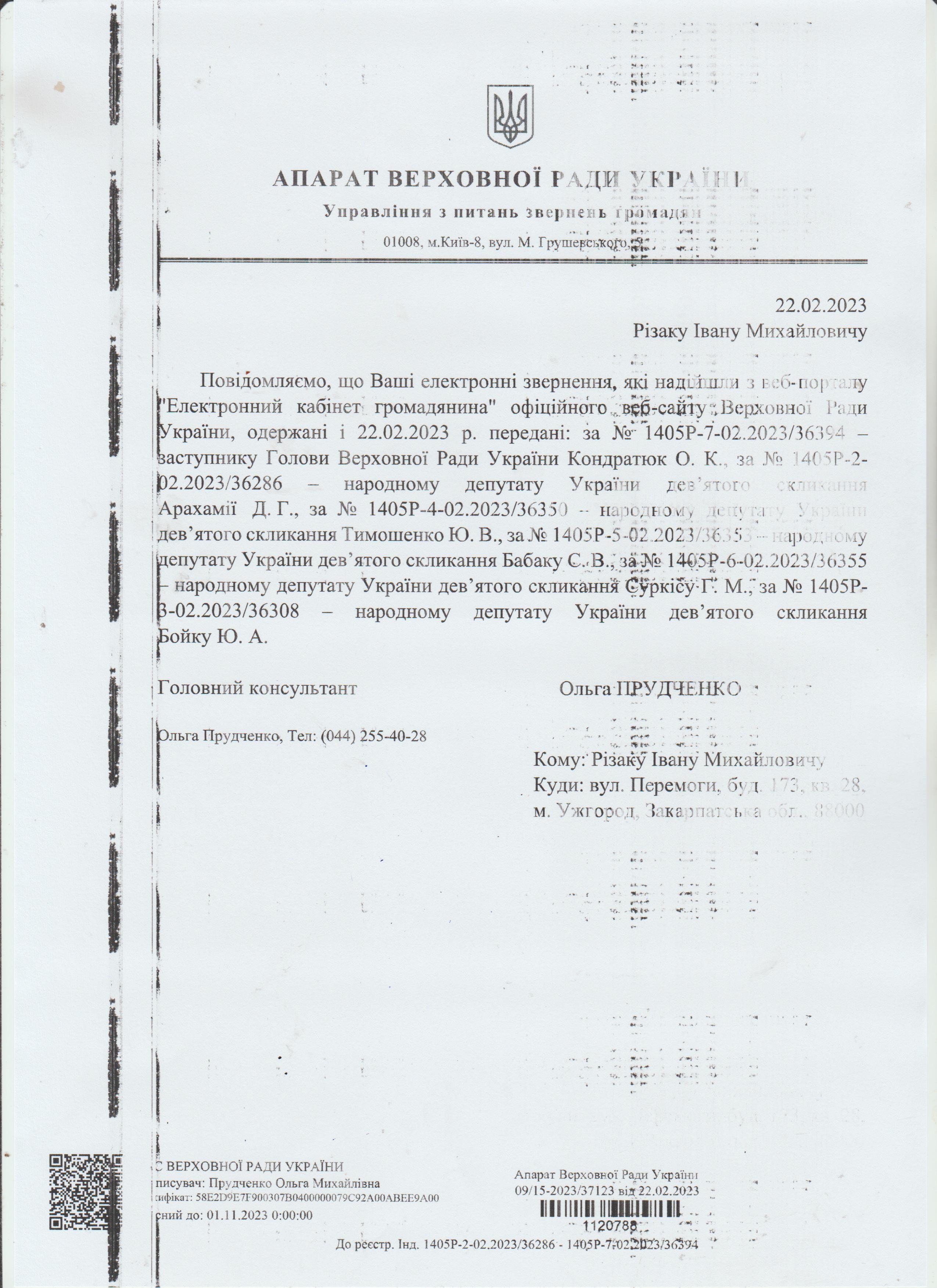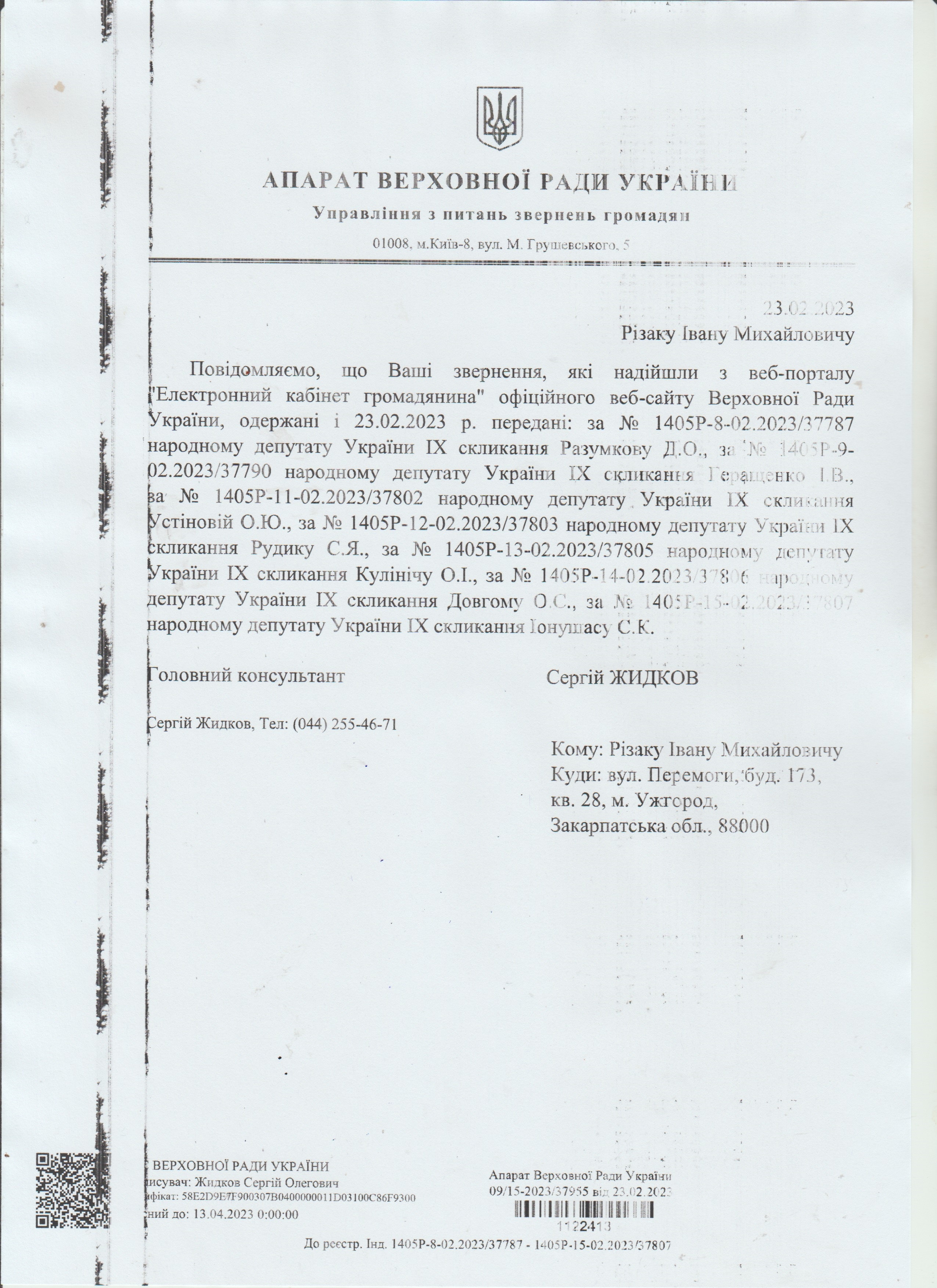 Шановні Анатолію Леонідовичу, Василю Дмитровичу, Василю Миколайовичу! Звертаюся до Вас як батько, як колишній керівник області, як простий житель цього краю, який хоче, щоб на цій землі ніколи не проливалася кров наших рідних, знайомих і близьких. Переконаний, що у політичного керівництва держави є достатньо волі для того, щоб поставити на місце «безпредельщиков», які пробують дестабілізувати ситуацію у державі. Переконаний, що події на кшталт помаранчевого терору у 2005 роців області більше не повторяться. З глибокою повагою, Різак Іван Михайлович, що проживає за адресою м. Ужгород, вул. Капушанська, б.173 кв. 28, голова Закарпатської обласної державної адміністрації (вересень 2002р. – січень 2005р.), народний депутат IV скликання, державний службовець І рангу, багаторічний голова і член координаційного комітету по боротьбі з організованою злочинністю при ОДА, кандидат фізико-математичних наук, тимчасово непрацюючий.