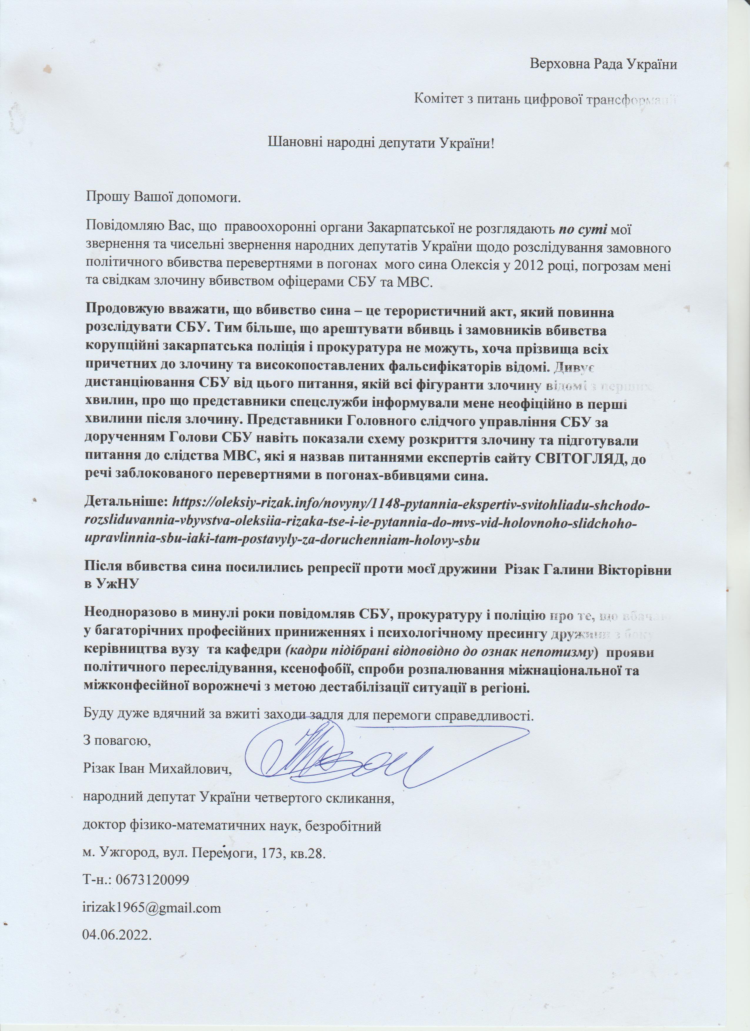 З метою сприяння слідству, а також всебічно об’єктивного розслідування справи прошу Вас доручити своїм підлеглим перевірити наступні питання: 1) чи міг володіти працівник ДПС в Закарпатській області Олексій Різак якоюсь інформацією про тіньовий та кримінальний бізнес в області, знання якої загрожувало б його життю? 2) перевірити у відповідних державних органах наявність у Різака Олексія Івановича та його близьких родичів майна, фінансів, земельних ділянок, підприємств, бізнесу, акцій, облігацій та інших цінних паперів, володіння якими могло б потенційно загрожувати його життю з боку конкурентів та інших співвласників? 3) чи були у нього відносини з громадянкою чи її родичами такими, що могли серйозно впливати на його майновий, матеріальний та ін. стан. 4) чи залучались до спеціальної перевірки, яку потрібно проходити при зарахуванні на державну службу, підрозділи зовнішнього спостереження якоїсь із правоохоронних структур області (я стверджую, що з часу переїзду мене в Закарпаття за нами було встановлене тотальне зовнішнє спостереження)? 5) хотілося б дізнатися (думаю, що це не є слідчою таємницею) в який час і з допомогою якого транспорту 16 листопада 2012 року виїхав син від своєї дівчини, чи проводжала вона його сама або з близькими родичами, чи бачила щось підозріле і яким таксі він виїжджав додому? 6) хотілося б також дізнатися хто першим побачив тіло вбитого юнака і повідомив швидку допомогу і міліцію? 7) з метою перевірки версії спроби отруєння сина Олексія, прошу дати на перевірку у спеціальну токсикологічну лабораторію результати трьох аналізів в «Астра-дія» і одного аналізу, проведеного в кардіодиспансері кілька тижнів тому.
