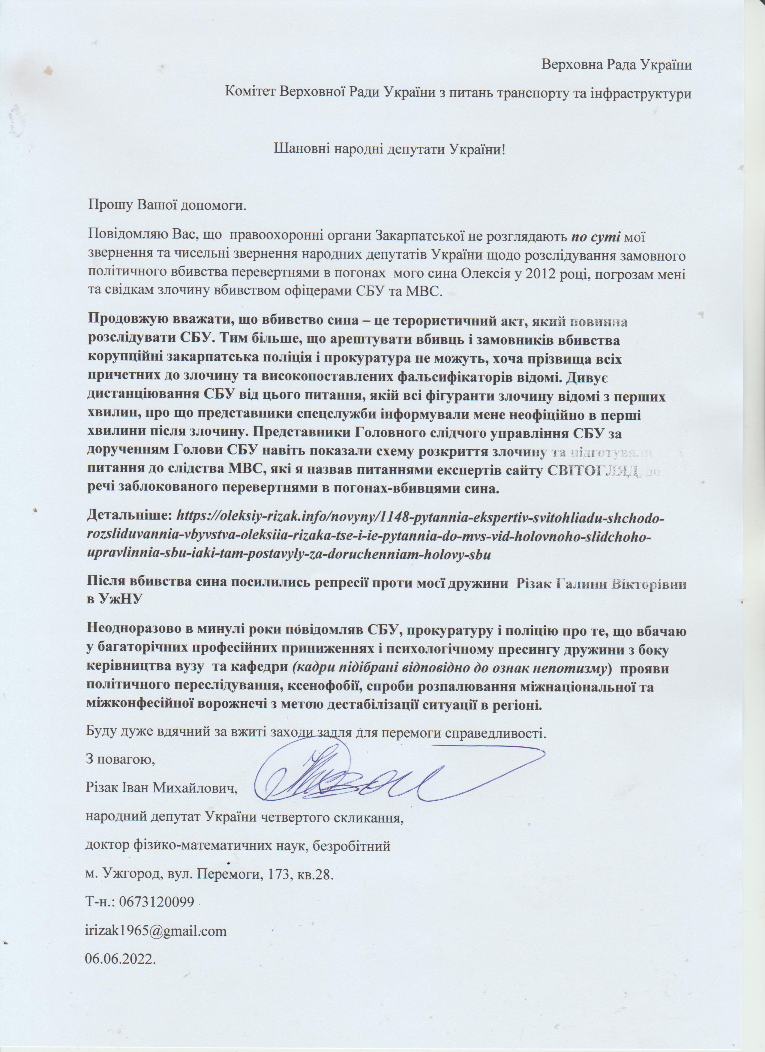 Шановні Анатолію Леонідовичу, Василю Дмитровичу, Василю Миколайовичу! Звертаюся до Вас як батько, як колишній керівник області, як простий житель цього краю, який хоче, щоб на цій землі ніколи не проливалася кров наших рідних, знайомих і близьких. Переконаний, що у політичного керівництва держави є достатньо волі для того, щоб поставити на місце «безпредельщиков», які пробують дестабілізувати ситуацію у державі. Переконаний, що події на кшталт помаранчевого терору у 2005 роців області більше не повторяться. З глибокою повагою, Різак Іван Михайлович, що проживає за адресою м. Ужгород, вул. Капушанська, б.173 кв. 28, голова Закарпатської обласної державної адміністрації (вересень 2002р. – січень 2005р.), народний депутат IV скликання, державний службовець І рангу, багаторічний голова і член координаційного комітету по боротьбі з організованою злочинністю при ОДА, кандидат фізико-математичних наук, тимчасово непрацюючий.