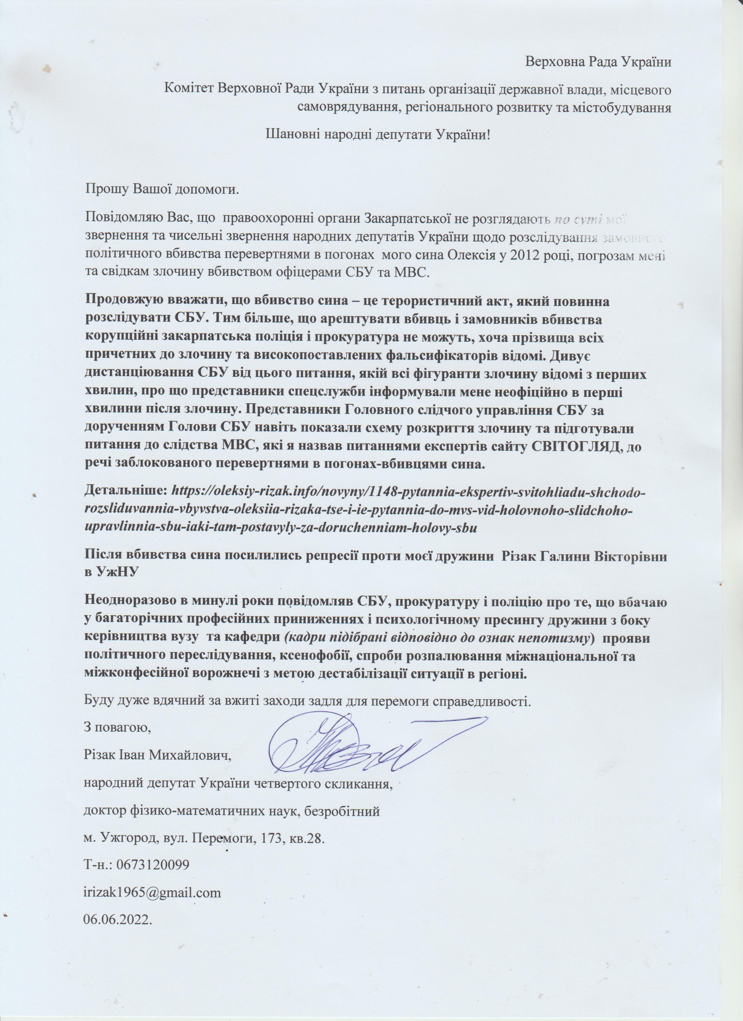 З тексту Постанови випливає, що факти, викладені у нижче наведеному листі Різака В.М. до начальника УМВС України в Закарпатській області генерала міліції Варцаби В.М. слідчим повністю проігноровані.