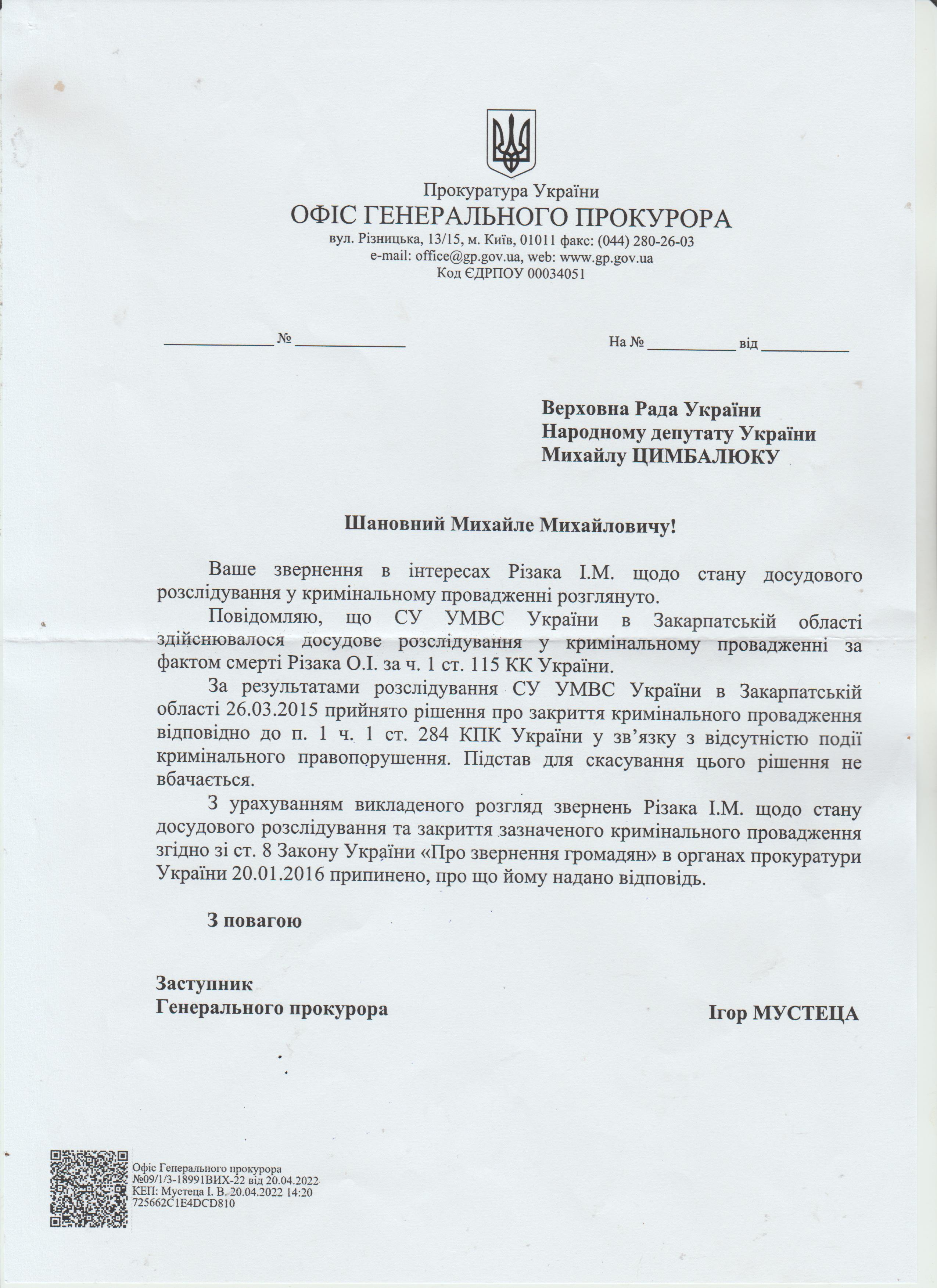 Згідно з листом старшого слідчого СУ УМВС України в Закарпатській області майора міліції Лазаря О.Ю. № 7/5930 від 27.12.2013 року, постановою про закриття кримінального провадження від 26 грудня 2013 року (далі за текстом – «Постанова») на підставі п.1 ч.1 ст.284 КПК України закрито кримінальне провадження № 12012070030000012 за фактом вбивства Різака О.І., за ознаками кримінального правопорушення, передбаченого ч.1 ст.115 КК України.