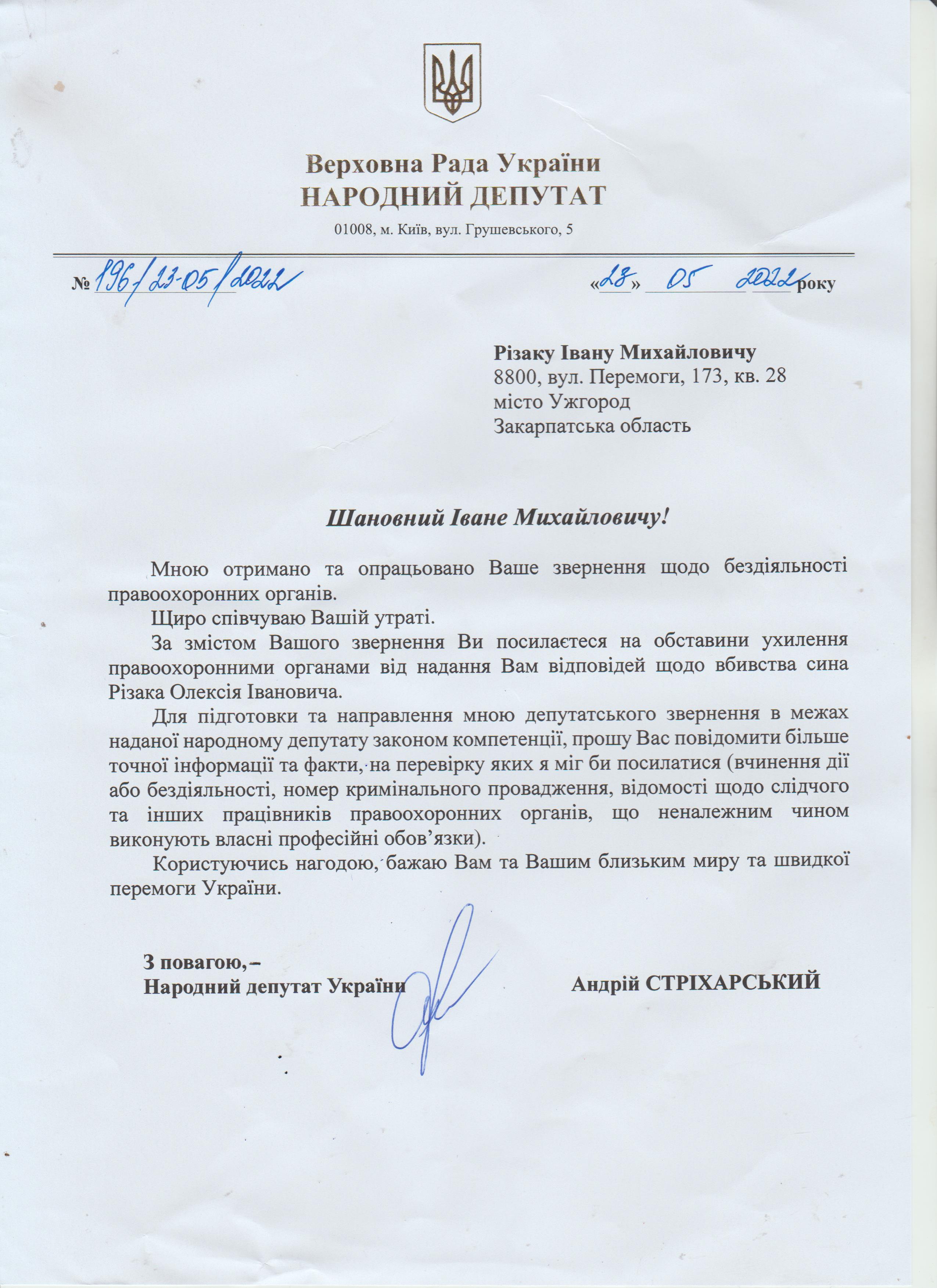 Це дає мені підстави говорити про те, що вбивство мого сина – чітко спланована спецоперація з відповідним інформаційним забезпеченням по своїм масштабам схожа на гебельсівську пропаганду. На час поширення цієї версії загибелі сина не було жодної, підкреслюю жодної, підстави говорити про самогубство, оскільки на той час слідчі не знайшли і сліду падіння з багатоповерхівки Олексія Різака, а також не провели жодної слідчої дії з громадянкою із-за «нещасливої» любові до якої мій син закінчив життя самогубством. Щиро прошу Вас, в найближчі години перекваліфікувати цю трагедію за статею КПК «вбивство» і всебічно, об’єктивно та системно провести відповідні слідчі дії для знаходження впливових замовників і звірів-вбивць мого рідного сина. Коротко Вас проінформую, що Різак Олексій Іванович, 1989 р.н., магістр фінансів (закінчив економічний факультет Харківського національного університету імені В.Н. Каразіна з відзнакою), магістр – юрист (закінчив магістратуру національного університету «Юридична академія України імені Ярослава Мудрого»), має військове звання – молодший лейтенант запасу, працював головним державним податковим інспектором першого рангу ДПС у Закарпатській області. Активно займався спортом. У свій час виступав за юнацьку збірну України з футболу, професійний клуб ФК «Закарпаття». На сьогоднішній день виступав за збірну ДПС у Закарпатській області, щоденно займався фізкультурою (для прикладу скажу, щоранку віджимався до 500 разів, а кількість ранкових стрибків на скакалці сягала 2000 разів, разом зі мною освоював східні єдиноборства), мав щирі відносини із дівчиною, колегами по роботі, був серйозним і відповідальним фахівцем. Додам також, що за півтори години до знаходження його тіла я спілкувався з ним особисто по телефону і обговорював подробиці матчу чемпіонату Італії з футболу Мілан – Фіорентина, під час цієї розмови ми обговорили майбутню поїздку у Київ, а також похід у гості до знайомих. Переконаний, нічого не могло статися за ці півтори години після нашої доброї розмови з почуттям гумору і присутності його дівчини, якій я передав вітання.