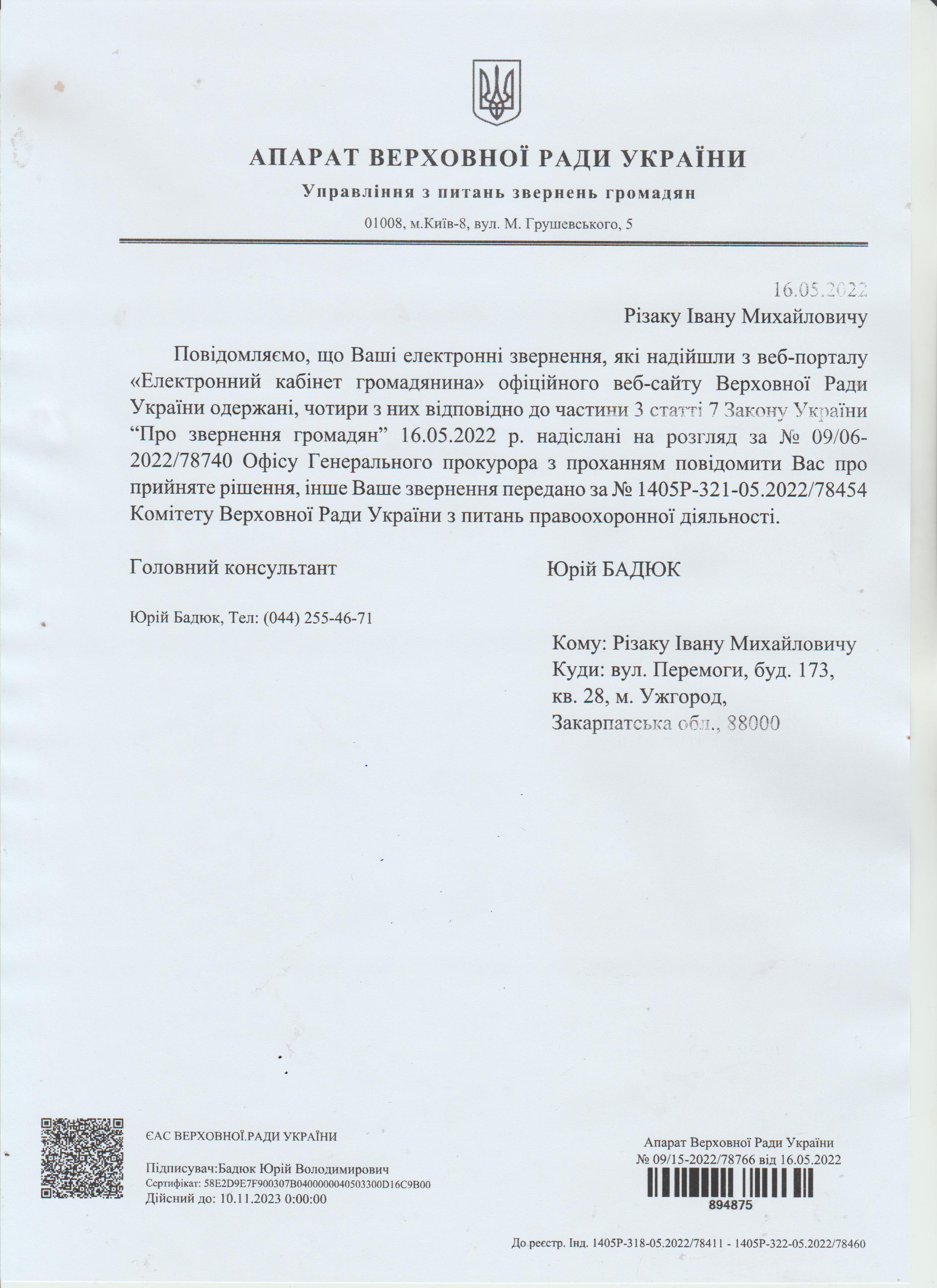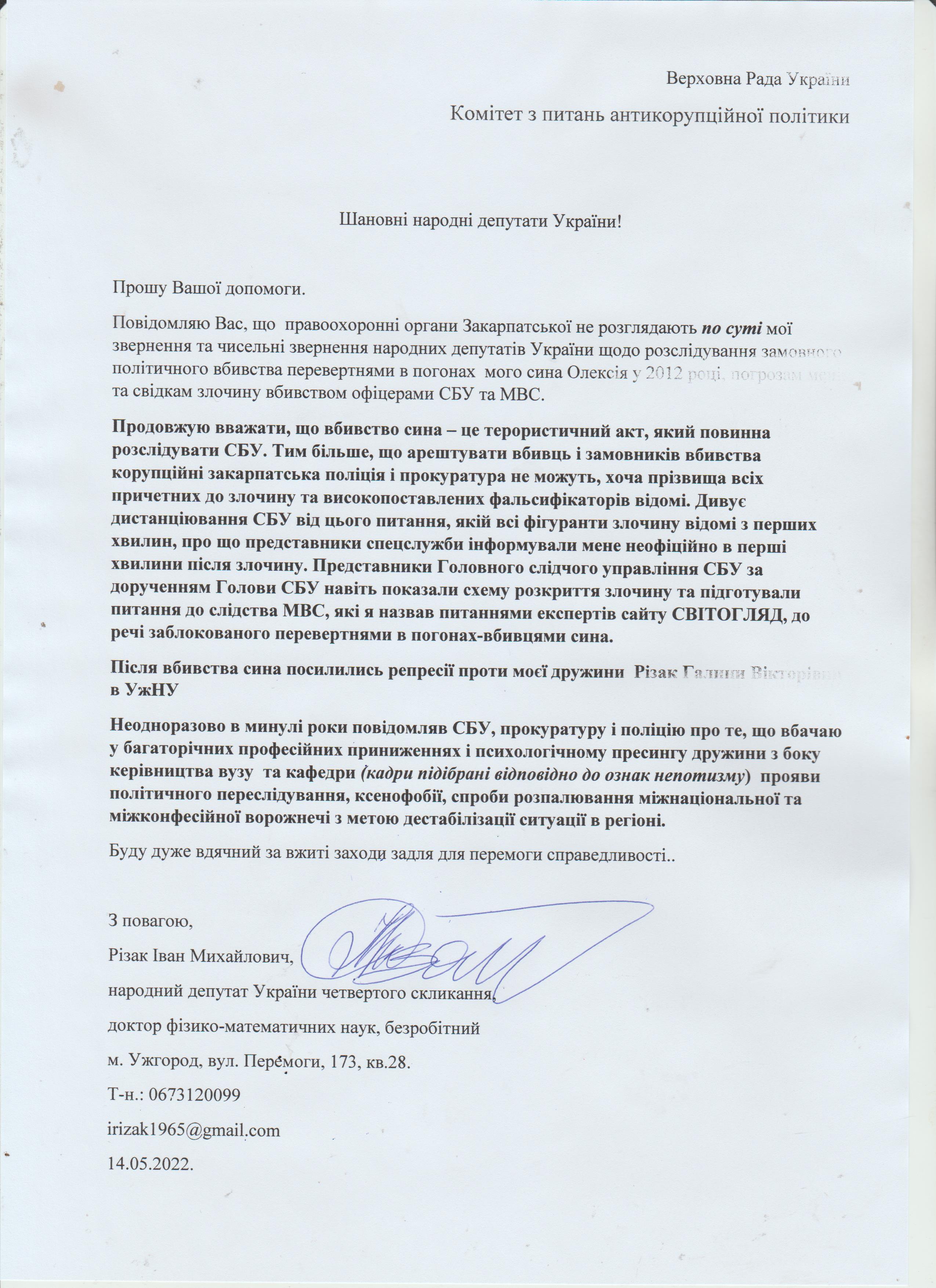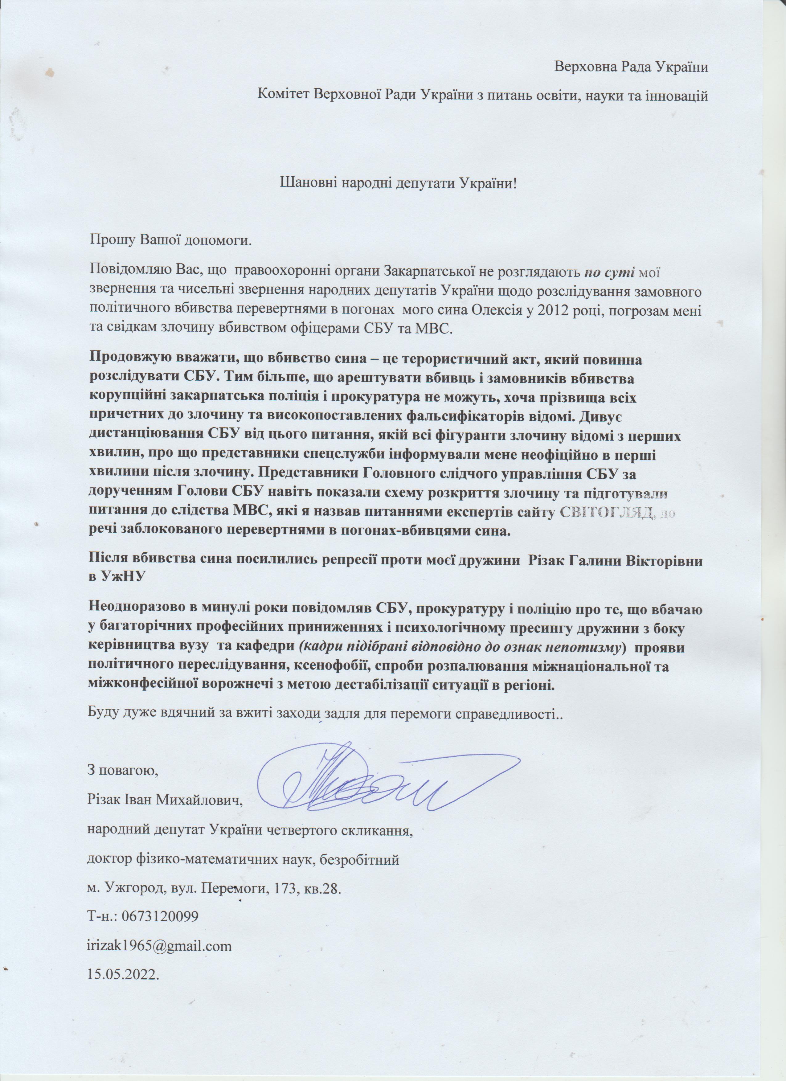 Шановні Анатолію Леонідовичу, Василю Дмитровичу, Василю Миколайовичу! Звертаюся до Вас як батько, як колишній керівник області, як простий житель цього краю, який хоче, щоб на цій землі ніколи не проливалася кров наших рідних, знайомих і близьких. Переконаний, що у політичного керівництва держави є достатньо волі для того, щоб поставити на місце «безпредельщиков», які пробують дестабілізувати ситуацію у державі. Переконаний, що події на кшталт помаранчевого терору у 2005 роців області більше не повторяться. З глибокою повагою, Різак Іван Михайлович, що проживає за адресою м. Ужгород, вул. Капушанська, б.173 кв. 28, голова Закарпатської обласної державної адміністрації (вересень 2002р. – січень 2005р.), народний депутат IV скликання, державний службовець І рангу, багаторічний голова і член координаційного комітету по боротьбі з організованою злочинністю при ОДА, кандидат фізико-математичних наук, тимчасово непрацюючий.