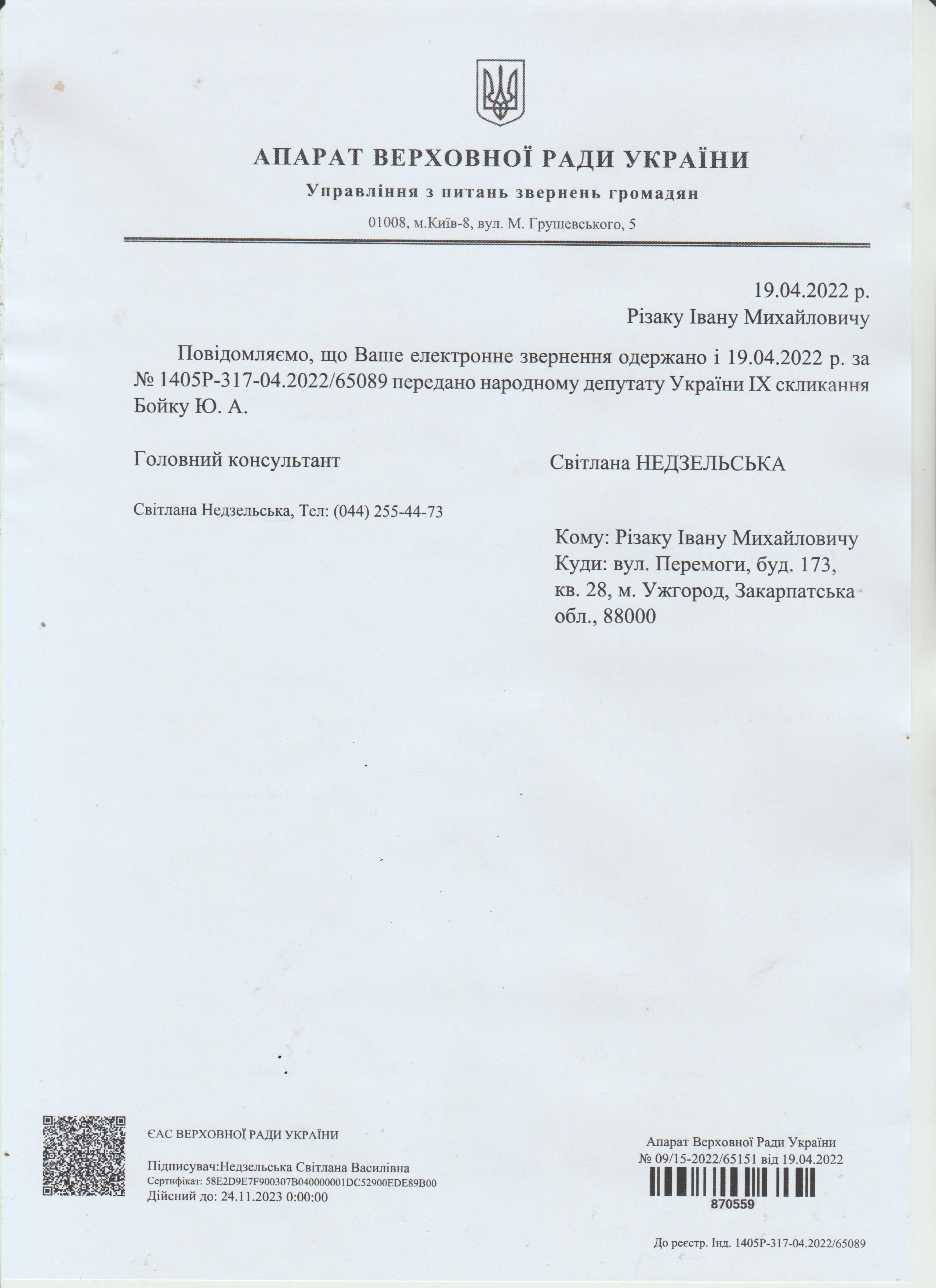 Шановні Анатолію Леонідовичу, Василю Дмитровичу, Василю Миколайовичу! Звертаюся до Вас як батько, як колишній керівник області, як простий житель цього краю, який хоче, щоб на цій землі ніколи не проливалася кров наших рідних, знайомих і близьких. Переконаний, що у політичного керівництва держави є достатньо волі для того, щоб поставити на місце «безпредельщиков», які пробують дестабілізувати ситуацію у державі. Переконаний, що події на кшталт помаранчевого терору у 2005 роців області більше не повторяться. З глибокою повагою, Різак Іван Михайлович, що проживає за адресою м. Ужгород, вул. Капушанська, б.173 кв. 28, голова Закарпатської обласної державної адміністрації (вересень 2002р. – січень 2005р.), народний депутат IV скликання, державний службовець І рангу, багаторічний голова і член координаційного комітету по боротьбі з організованою злочинністю при ОДА, кандидат фізико-математичних наук, тимчасово непрацюючий.