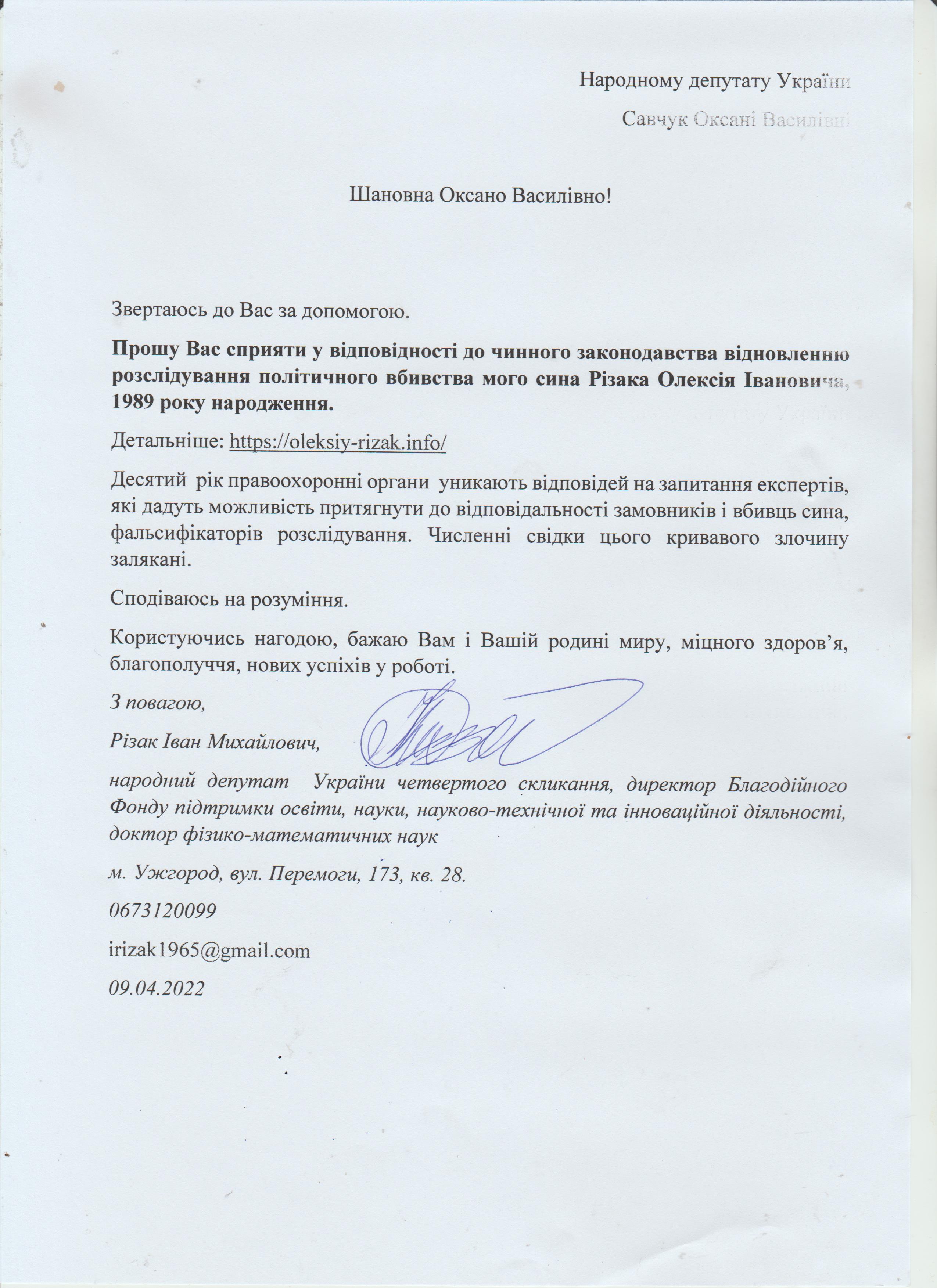 З метою сприяння слідству, а також всебічно об’єктивного розслідування справи прошу Вас доручити своїм підлеглим перевірити наступні питання: 1) чи міг володіти працівник ДПС в Закарпатській області Олексій Різак якоюсь інформацією про тіньовий та кримінальний бізнес в області, знання якої загрожувало б його життю? 2) перевірити у відповідних державних органах наявність у Різака Олексія Івановича та його близьких родичів майна, фінансів, земельних ділянок, підприємств, бізнесу, акцій, облігацій та інших цінних паперів, володіння якими могло б потенційно загрожувати його життю з боку конкурентів та інших співвласників? 3) чи були у нього відносини з громадянкою чи її родичами такими, що могли серйозно впливати на його майновий, матеріальний та ін. стан. 4) чи залучались до спеціальної перевірки, яку потрібно проходити при зарахуванні на державну службу, підрозділи зовнішнього спостереження якоїсь із правоохоронних структур області (я стверджую, що з часу переїзду мене в Закарпаття за нами було встановлене тотальне зовнішнє спостереження)? 5) хотілося б дізнатися (думаю, що це не є слідчою таємницею) в який час і з допомогою якого транспорту 16 листопада 2012 року виїхав син від своєї дівчини, чи проводжала вона його сама або з близькими родичами, чи бачила щось підозріле і яким таксі він виїжджав додому? 6) хотілося б також дізнатися хто першим побачив тіло вбитого юнака і повідомив швидку допомогу і міліцію? 7) з метою перевірки версії спроби отруєння сина Олексія, прошу дати на перевірку у спеціальну токсикологічну лабораторію результати трьох аналізів в «Астра-дія» і одного аналізу, проведеного в кардіодиспансері кілька тижнів тому.