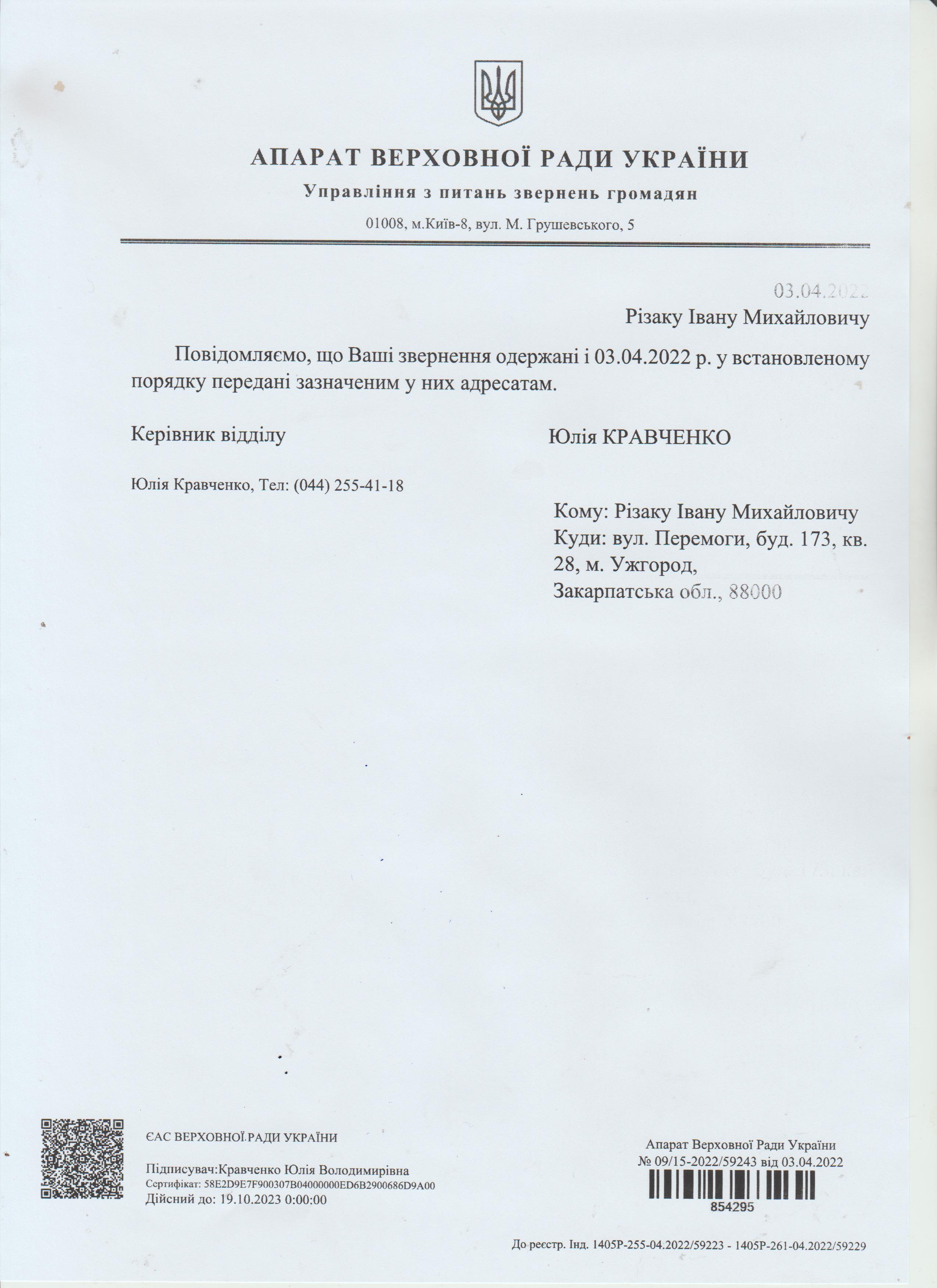 Шановні Анатолію Леонідовичу, Василю Дмитровичу, Василю Миколайовичу! Звертаюся до Вас як батько, як колишній керівник області, як простий житель цього краю, який хоче, щоб на цій землі ніколи не проливалася кров наших рідних, знайомих і близьких. Переконаний, що у політичного керівництва держави є достатньо волі для того, щоб поставити на місце «безпредельщиков», які пробують дестабілізувати ситуацію у державі. Переконаний, що події на кшталт помаранчевого терору у 2005 роців області більше не повторяться. З глибокою повагою, Різак Іван Михайлович, що проживає за адресою м. Ужгород, вул. Капушанська, б.173 кв. 28, голова Закарпатської обласної державної адміністрації (вересень 2002р. – січень 2005р.), народний депутат IV скликання, державний службовець І рангу, багаторічний голова і член координаційного комітету по боротьбі з організованою злочинністю при ОДА, кандидат фізико-математичних наук, тимчасово непрацюючий.