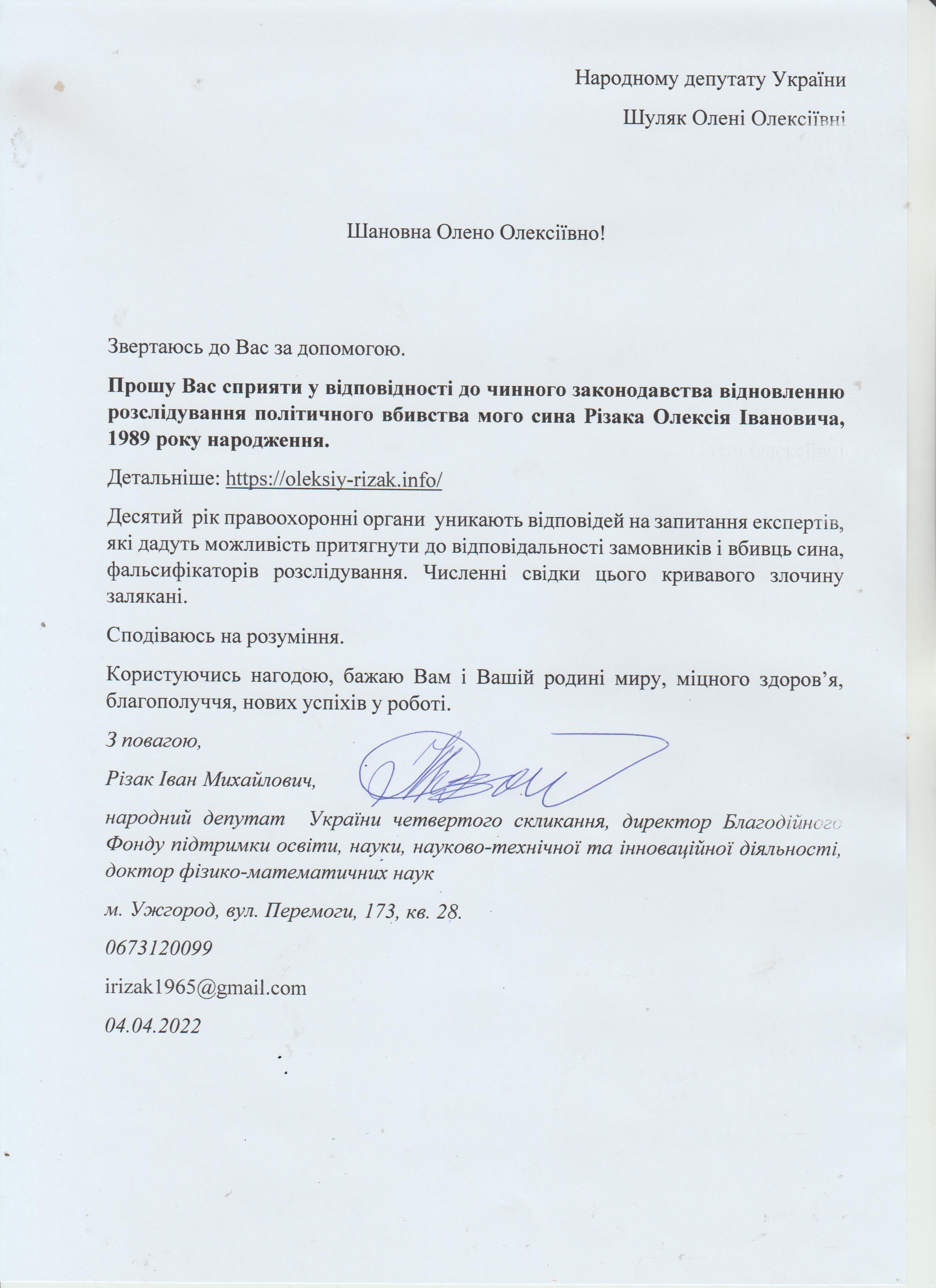 З метою сприяння слідству, а також всебічно об’єктивного розслідування справи прошу Вас доручити своїм підлеглим перевірити наступні питання: 1) чи міг володіти працівник ДПС в Закарпатській області Олексій Різак якоюсь інформацією про тіньовий та кримінальний бізнес в області, знання якої загрожувало б його життю? 2) перевірити у відповідних державних органах наявність у Різака Олексія Івановича та його близьких родичів майна, фінансів, земельних ділянок, підприємств, бізнесу, акцій, облігацій та інших цінних паперів, володіння якими могло б потенційно загрожувати його життю з боку конкурентів та інших співвласників? 3) чи були у нього відносини з громадянкою чи її родичами такими, що могли серйозно впливати на його майновий, матеріальний та ін. стан. 4) чи залучались до спеціальної перевірки, яку потрібно проходити при зарахуванні на державну службу, підрозділи зовнішнього спостереження якоїсь із правоохоронних структур області (я стверджую, що з часу переїзду мене в Закарпаття за нами було встановлене тотальне зовнішнє спостереження)? 5) хотілося б дізнатися (думаю, що це не є слідчою таємницею) в який час і з допомогою якого транспорту 16 листопада 2012 року виїхав син від своєї дівчини, чи проводжала вона його сама або з близькими родичами, чи бачила щось підозріле і яким таксі він виїжджав додому? 6) хотілося б також дізнатися хто першим побачив тіло вбитого юнака і повідомив швидку допомогу і міліцію? 7) з метою перевірки версії спроби отруєння сина Олексія, прошу дати на перевірку у спеціальну токсикологічну лабораторію результати трьох аналізів в «Астра-дія» і одного аналізу, проведеного в кардіодиспансері кілька тижнів тому.