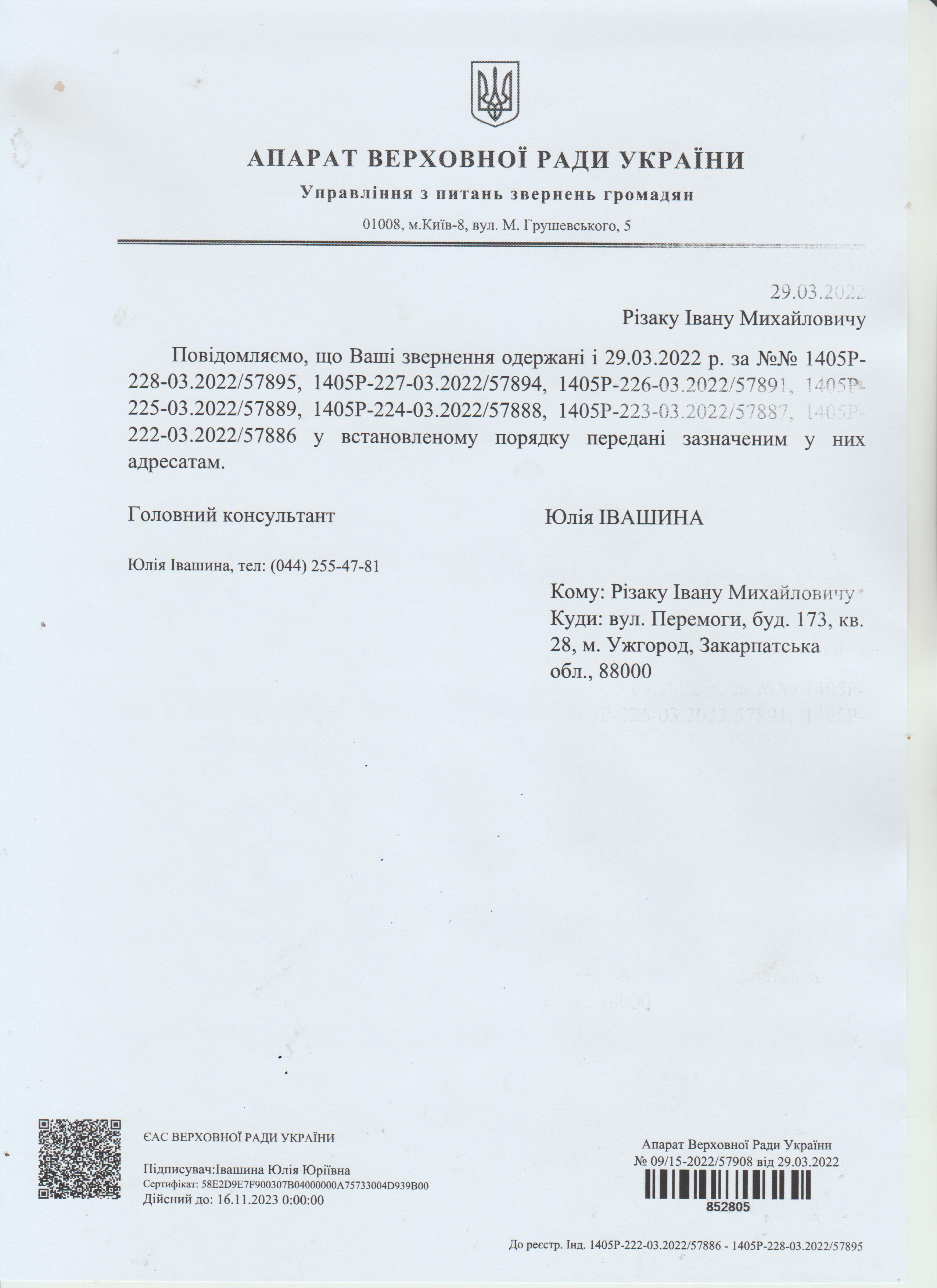 Іван Різак - Генеральному прокурору України: вважаю такі дії громадянина Ониська М.Ю. злочинними і особливо небезпечними з метою дискредитації рішень органів влади на час воєнного стану та поширення паніки серед населення Замовники вбивства сина з початком війни перейшли до прямих погроз Івану Різаку через всіх контактних осіб, посилили цькування Галини Різак. Це дивно, бо вони переоцінюють свої можливості, а особливо можливості колись близьких до екс-губернатора людей щодо впливу на його рішення. Всі вони сядуть надовго разом з такими "посередниками" та шістками в УжНУ. Ці виродки ще й воєнний стан пробують використати для погроз. Жаль, що державної влади в Закарпатті немає...
