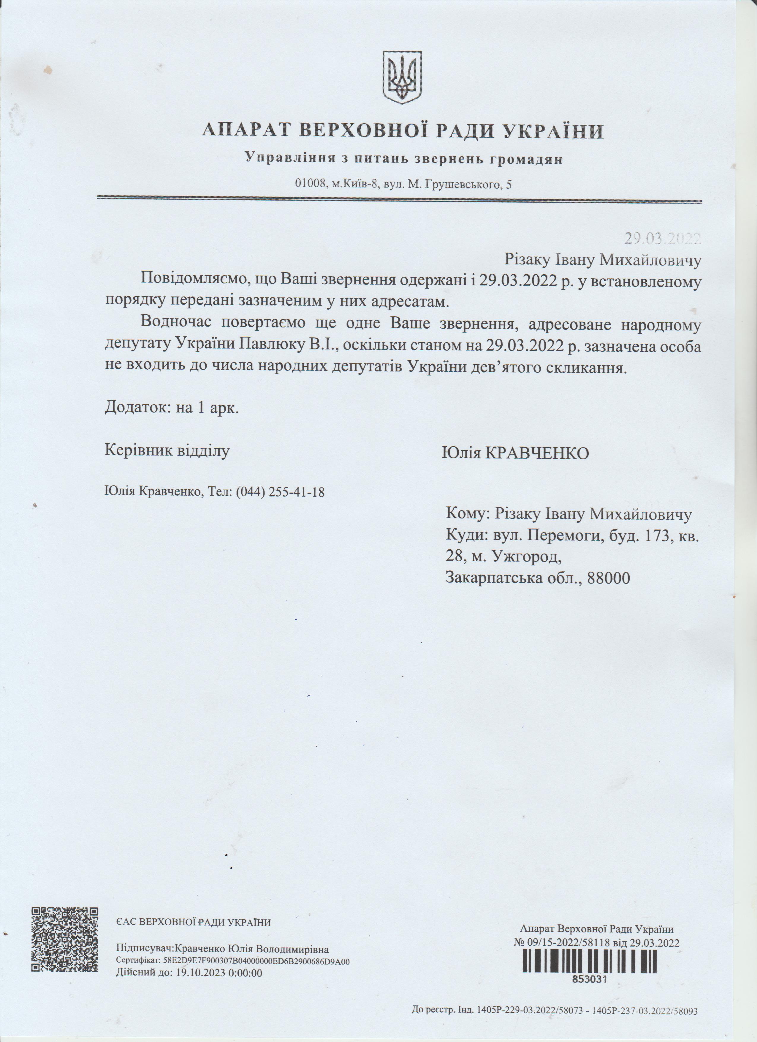 Шановні Анатолію Леонідовичу, Василю Дмитровичу, Василю Миколайовичу! Звертаюся до Вас як батько, як колишній керівник області, як простий житель цього краю, який хоче, щоб на цій землі ніколи не проливалася кров наших рідних, знайомих і близьких. Переконаний, що у політичного керівництва держави є достатньо волі для того, щоб поставити на місце «безпредельщиков», які пробують дестабілізувати ситуацію у державі. Переконаний, що події на кшталт помаранчевого терору у 2005 роців області більше не повторяться. З глибокою повагою, Різак Іван Михайлович, що проживає за адресою м. Ужгород, вул. Капушанська, б.173 кв. 28, голова Закарпатської обласної державної адміністрації (вересень 2002р. – січень 2005р.), народний депутат IV скликання, державний службовець І рангу, багаторічний голова і член координаційного комітету по боротьбі з організованою злочинністю при ОДА, кандидат фізико-математичних наук, тимчасово непрацюючий.