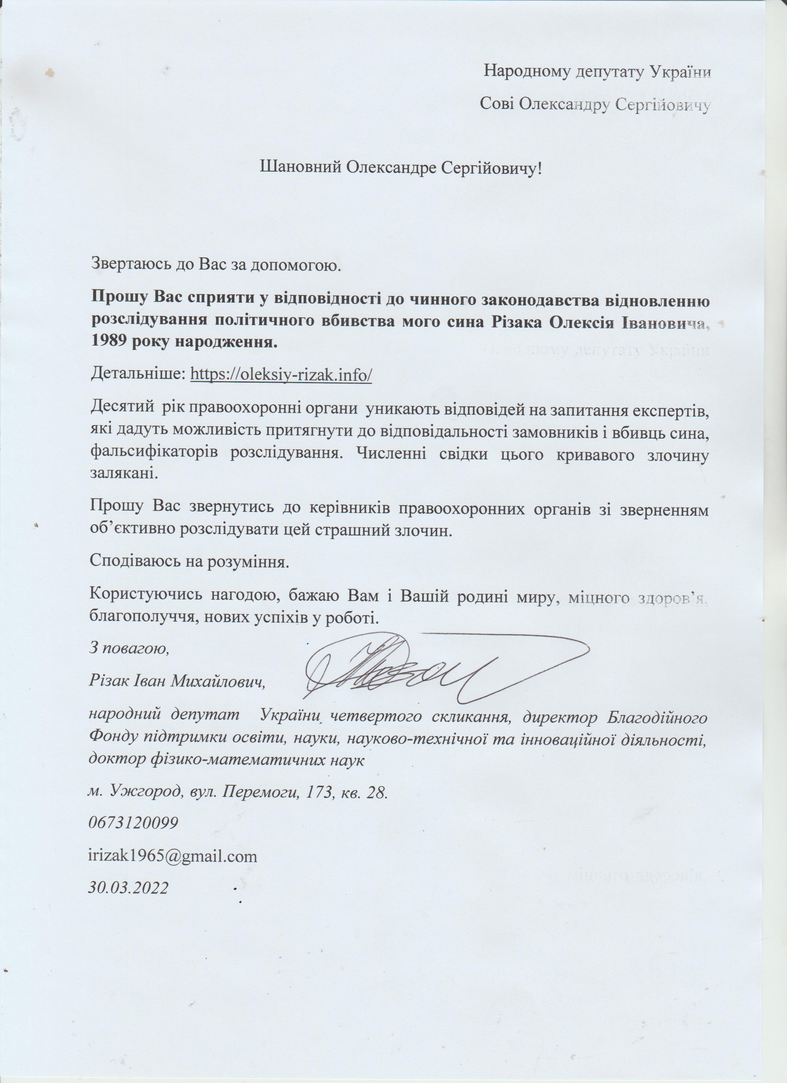 З метою сприяння слідству, а також всебічно об’єктивного розслідування справи прошу Вас доручити своїм підлеглим перевірити наступні питання: 1) чи міг володіти працівник ДПС в Закарпатській області Олексій Різак якоюсь інформацією про тіньовий та кримінальний бізнес в області, знання якої загрожувало б його життю? 2) перевірити у відповідних державних органах наявність у Різака Олексія Івановича та його близьких родичів майна, фінансів, земельних ділянок, підприємств, бізнесу, акцій, облігацій та інших цінних паперів, володіння якими могло б потенційно загрожувати його життю з боку конкурентів та інших співвласників? 3) чи були у нього відносини з громадянкою чи її родичами такими, що могли серйозно впливати на його майновий, матеріальний та ін. стан. 4) чи залучались до спеціальної перевірки, яку потрібно проходити при зарахуванні на державну службу, підрозділи зовнішнього спостереження якоїсь із правоохоронних структур області (я стверджую, що з часу переїзду мене в Закарпаття за нами було встановлене тотальне зовнішнє спостереження)? 5) хотілося б дізнатися (думаю, що це не є слідчою таємницею) в який час і з допомогою якого транспорту 16 листопада 2012 року виїхав син від своєї дівчини, чи проводжала вона його сама або з близькими родичами, чи бачила щось підозріле і яким таксі він виїжджав додому? 6) хотілося б також дізнатися хто першим побачив тіло вбитого юнака і повідомив швидку допомогу і міліцію? 7) з метою перевірки версії спроби отруєння сина Олексія, прошу дати на перевірку у спеціальну токсикологічну лабораторію результати трьох аналізів в «Астра-дія» і одного аналізу, проведеного в кардіодиспансері кілька тижнів тому.
