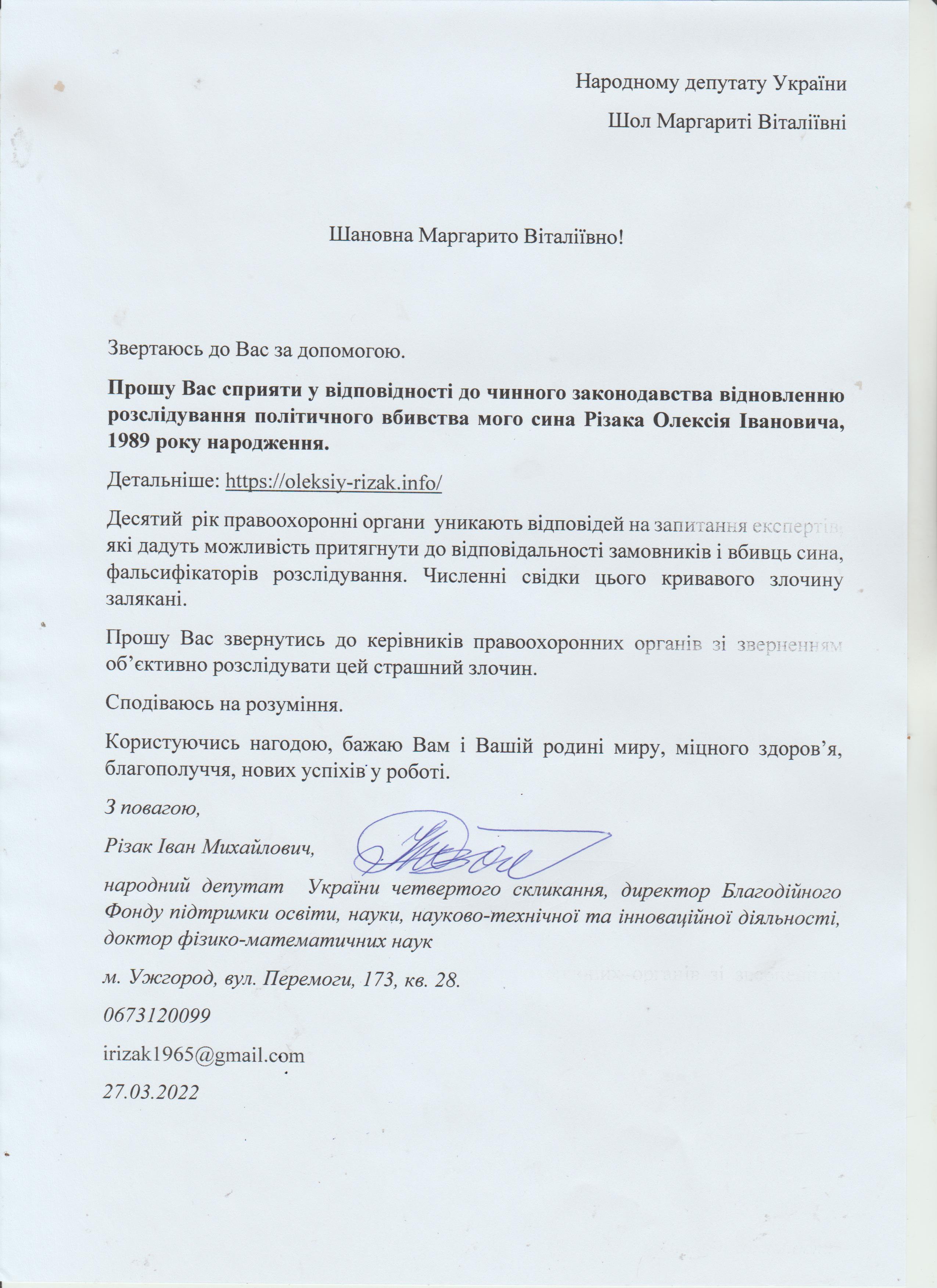 З метою сприяння слідству, а також всебічно об’єктивного розслідування справи прошу Вас доручити своїм підлеглим перевірити наступні питання: 1) чи міг володіти працівник ДПС в Закарпатській області Олексій Різак якоюсь інформацією про тіньовий та кримінальний бізнес в області, знання якої загрожувало б його життю? 2) перевірити у відповідних державних органах наявність у Різака Олексія Івановича та його близьких родичів майна, фінансів, земельних ділянок, підприємств, бізнесу, акцій, облігацій та інших цінних паперів, володіння якими могло б потенційно загрожувати його життю з боку конкурентів та інших співвласників? 3) чи були у нього відносини з громадянкою чи її родичами такими, що могли серйозно впливати на його майновий, матеріальний та ін. стан. 4) чи залучались до спеціальної перевірки, яку потрібно проходити при зарахуванні на державну службу, підрозділи зовнішнього спостереження якоїсь із правоохоронних структур області (я стверджую, що з часу переїзду мене в Закарпаття за нами було встановлене тотальне зовнішнє спостереження)? 5) хотілося б дізнатися (думаю, що це не є слідчою таємницею) в який час і з допомогою якого транспорту 16 листопада 2012 року виїхав син від своєї дівчини, чи проводжала вона його сама або з близькими родичами, чи бачила щось підозріле і яким таксі він виїжджав додому? 6) хотілося б також дізнатися хто першим побачив тіло вбитого юнака і повідомив швидку допомогу і міліцію? 7) з метою перевірки версії спроби отруєння сина Олексія, прошу дати на перевірку у спеціальну токсикологічну лабораторію результати трьох аналізів в «Астра-дія» і одного аналізу, проведеного в кардіодиспансері кілька тижнів тому.