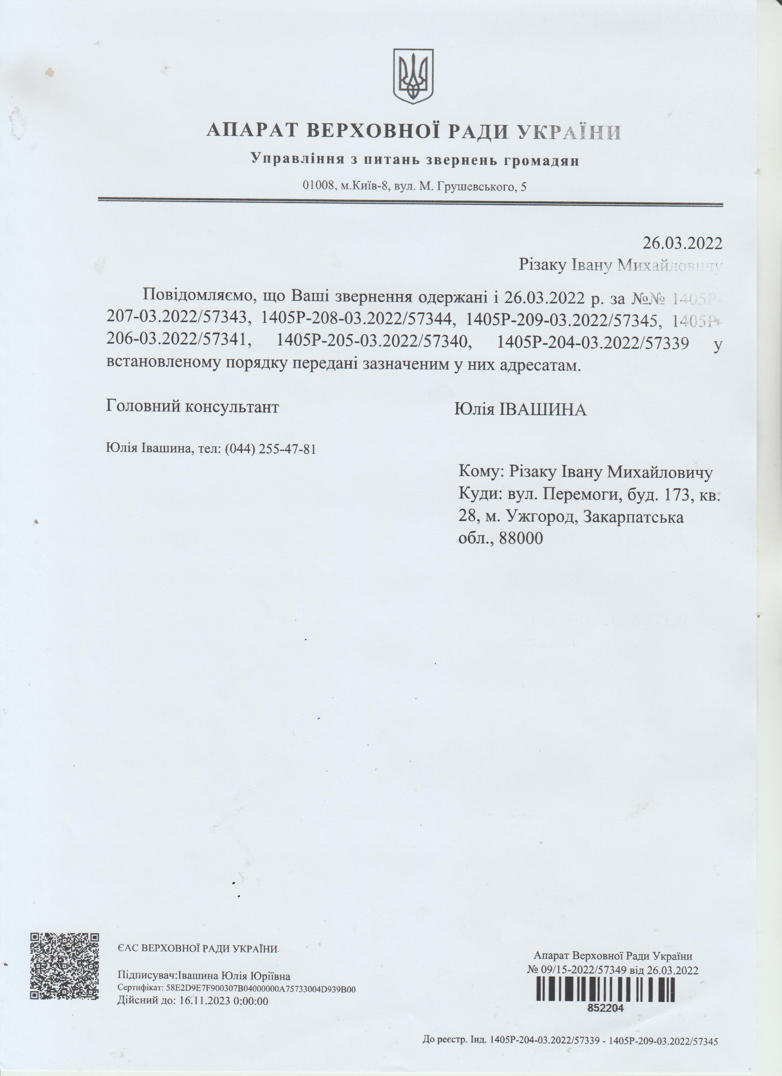 Шановні Анатолію Леонідовичу, Василю Дмитровичу, Василю Миколайовичу! Звертаюся до Вас як батько, як колишній керівник області, як простий житель цього краю, який хоче, щоб на цій землі ніколи не проливалася кров наших рідних, знайомих і близьких. Переконаний, що у політичного керівництва держави є достатньо волі для того, щоб поставити на місце «безпредельщиков», які пробують дестабілізувати ситуацію у державі. Переконаний, що події на кшталт помаранчевого терору у 2005 роців області більше не повторяться. З глибокою повагою, Різак Іван Михайлович, що проживає за адресою м. Ужгород, вул. Капушанська, б.173 кв. 28, голова Закарпатської обласної державної адміністрації (вересень 2002р. – січень 2005р.), народний депутат IV скликання, державний службовець І рангу, багаторічний голова і член координаційного комітету по боротьбі з організованою злочинністю при ОДА, кандидат фізико-математичних наук, тимчасово непрацюючий.