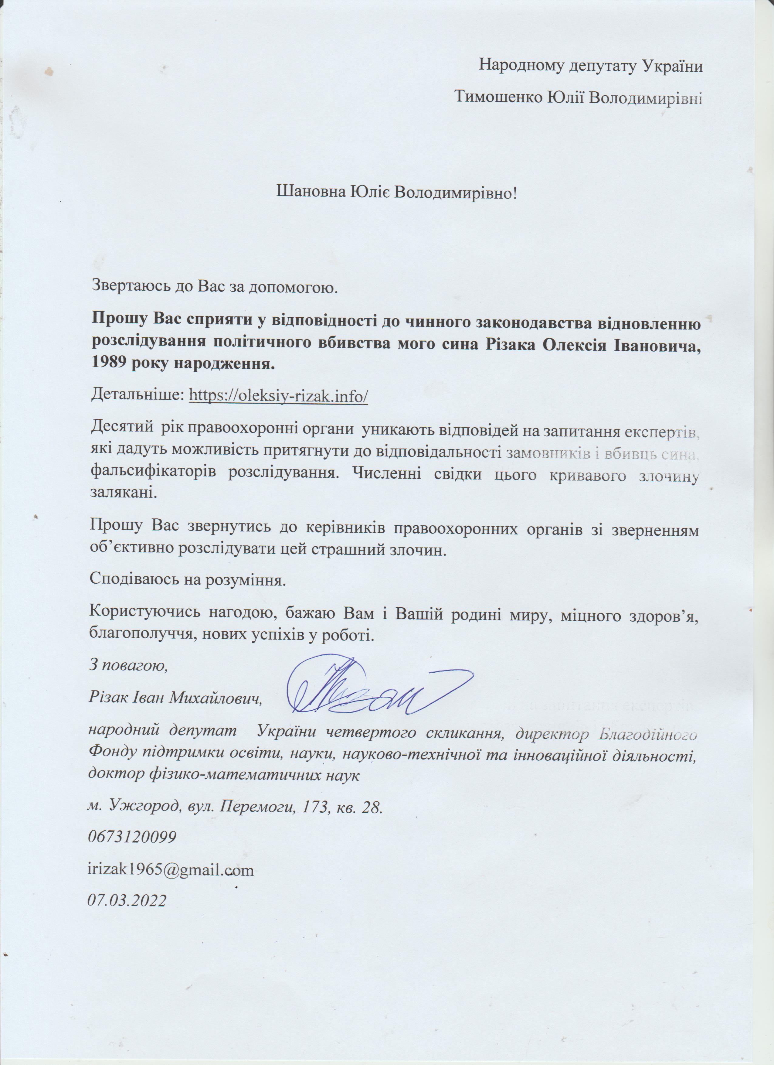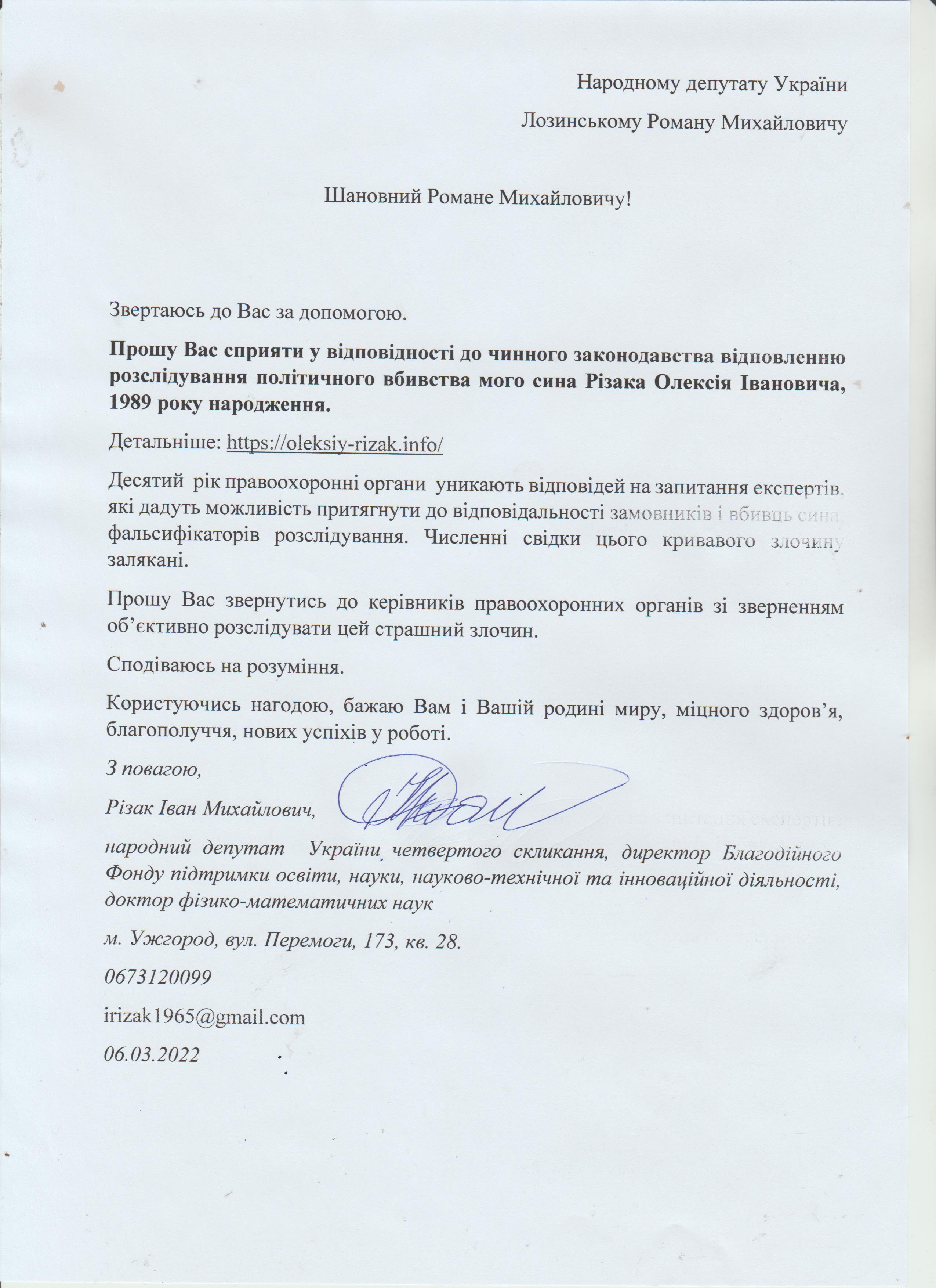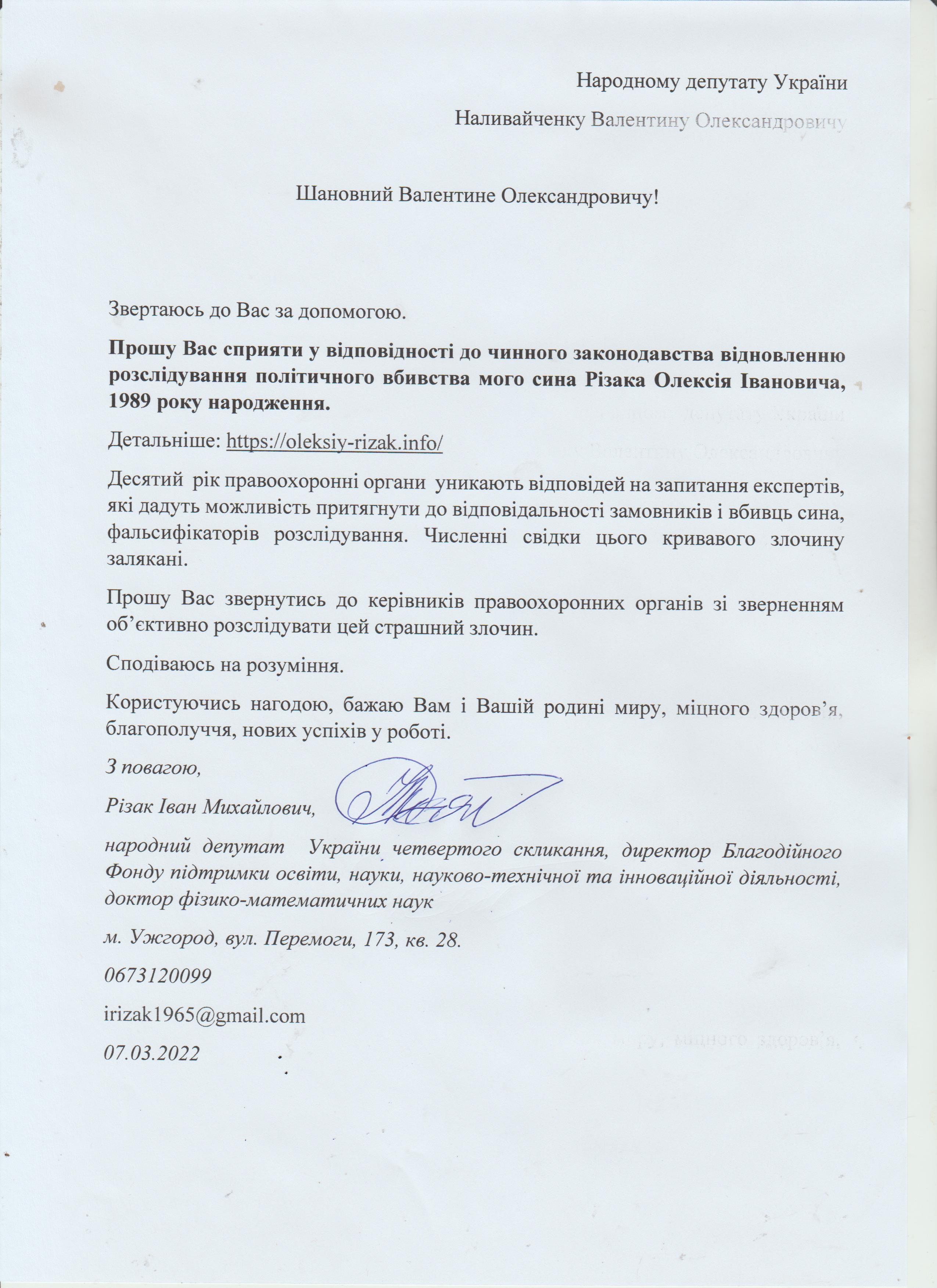 Це дає мені підстави говорити про те, що вбивство мого сина – чітко спланована спецоперація з відповідним інформаційним забезпеченням по своїм масштабам схожа на гебельсівську пропаганду. На час поширення цієї версії загибелі сина не було жодної, підкреслюю жодної, підстави говорити про самогубство, оскільки на той час слідчі не знайшли і сліду падіння з багатоповерхівки Олексія Різака, а також не провели жодної слідчої дії з громадянкою із-за «нещасливої» любові до якої мій син закінчив життя самогубством. Щиро прошу Вас, в найближчі години перекваліфікувати цю трагедію за статею КПК «вбивство» і всебічно, об’єктивно та системно провести відповідні слідчі дії для знаходження впливових замовників і звірів-вбивць мого рідного сина. Коротко Вас проінформую, що Різак Олексій Іванович, 1989 р.н., магістр фінансів (закінчив економічний факультет Харківського національного університету імені В.Н. Каразіна з відзнакою), магістр – юрист (закінчив магістратуру національного університету «Юридична академія України імені Ярослава Мудрого»), має військове звання – молодший лейтенант запасу, працював головним державним податковим інспектором першого рангу ДПС у Закарпатській області. Активно займався спортом. У свій час виступав за юнацьку збірну України з футболу, професійний клуб ФК «Закарпаття». На сьогоднішній день виступав за збірну ДПС у Закарпатській області, щоденно займався фізкультурою (для прикладу скажу, щоранку віджимався до 500 разів, а кількість ранкових стрибків на скакалці сягала 2000 разів, разом зі мною освоював східні єдиноборства), мав щирі відносини із дівчиною, колегами по роботі, був серйозним і відповідальним фахівцем. Додам також, що за півтори години до знаходження його тіла я спілкувався з ним особисто по телефону і обговорював подробиці матчу чемпіонату Італії з футболу Мілан – Фіорентина, під час цієї розмови ми обговорили майбутню поїздку у Київ, а також похід у гості до знайомих. Переконаний, нічого не могло статися за ці півтори години після нашої доброї розмови з почуттям гумору і присутності його дівчини, якій я передав вітання.