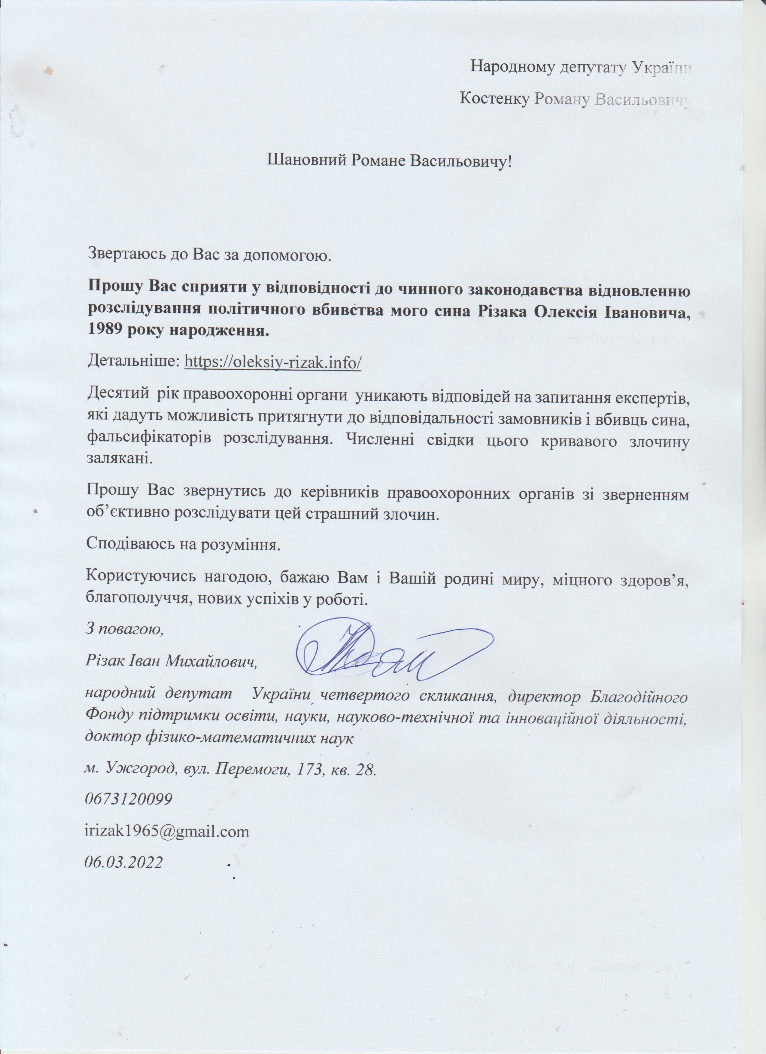 Шановні Анатолію Леонідовичу, Василю Дмитровичу, Василю Миколайовичу! Звертаюся до Вас як батько, як колишній керівник області, як простий житель цього краю, який хоче, щоб на цій землі ніколи не проливалася кров наших рідних, знайомих і близьких. Переконаний, що у політичного керівництва держави є достатньо волі для того, щоб поставити на місце «безпредельщиков», які пробують дестабілізувати ситуацію у державі. Переконаний, що події на кшталт помаранчевого терору у 2005 роців області більше не повторяться. З глибокою повагою, Різак Іван Михайлович, що проживає за адресою м. Ужгород, вул. Капушанська, б.173 кв. 28, голова Закарпатської обласної державної адміністрації (вересень 2002р. – січень 2005р.), народний депутат IV скликання, державний службовець І рангу, багаторічний голова і член координаційного комітету по боротьбі з організованою злочинністю при ОДА, кандидат фізико-математичних наук, тимчасово непрацюючий.
