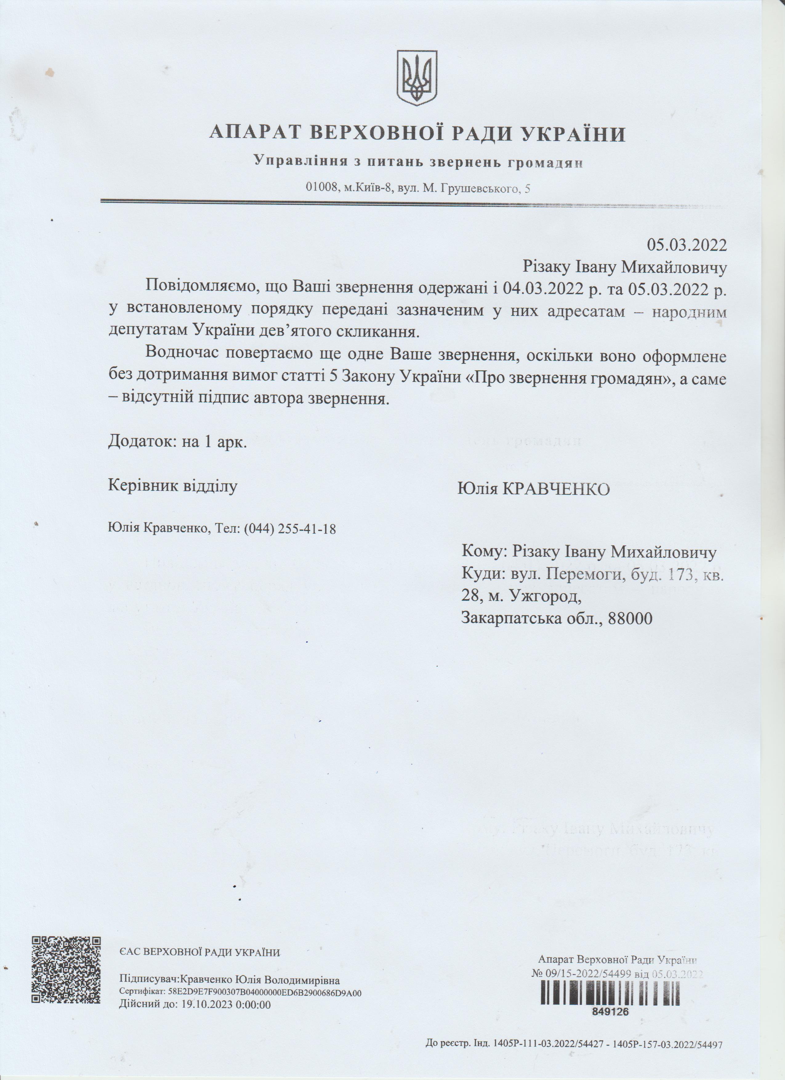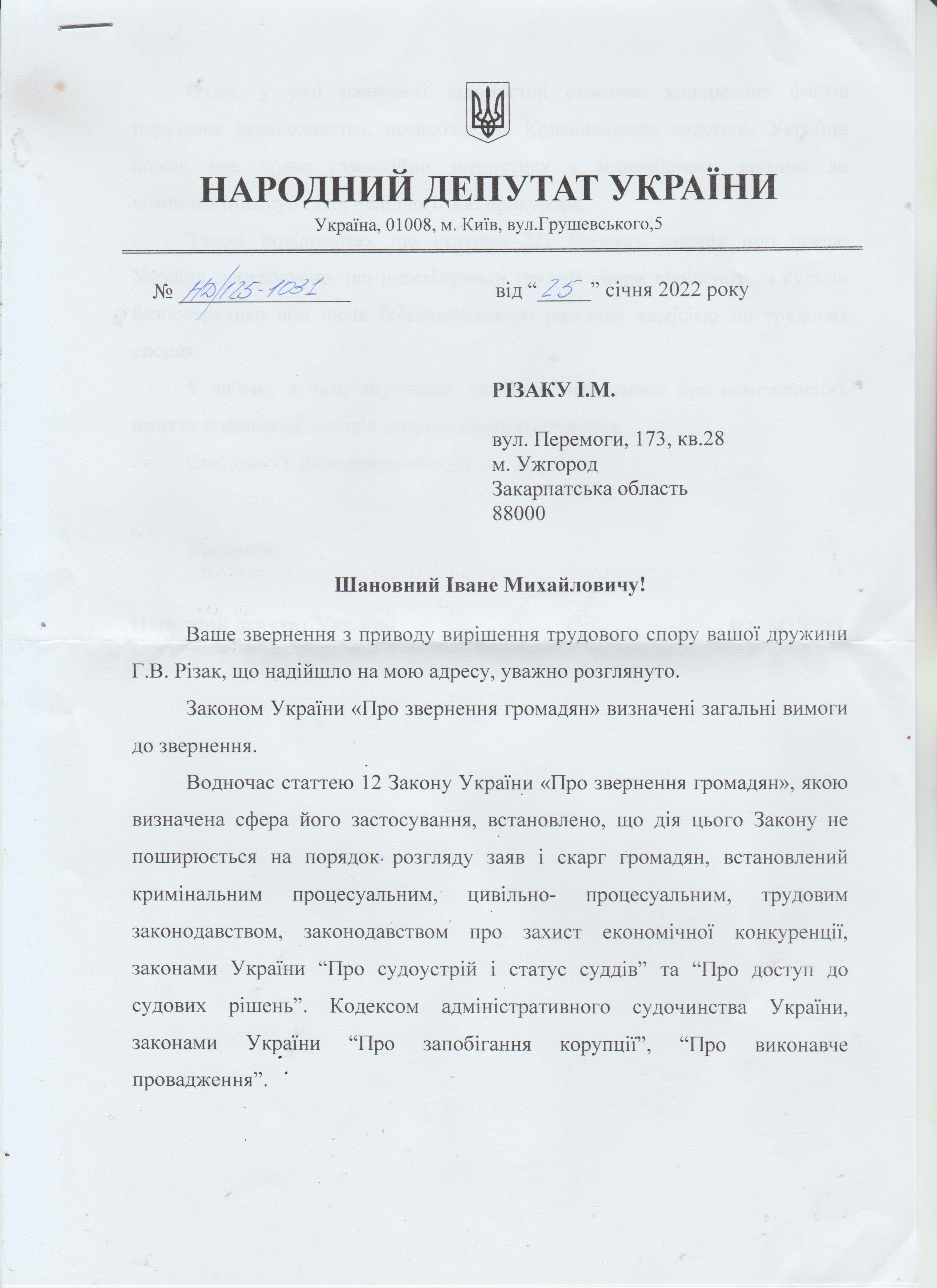 Шановні Анатолію Леонідовичу, Василю Дмитровичу, Василю Миколайовичу! Звертаюся до Вас як батько, як колишній керівник області, як простий житель цього краю, який хоче, щоб на цій землі ніколи не проливалася кров наших рідних, знайомих і близьких. Переконаний, що у політичного керівництва держави є достатньо волі для того, щоб поставити на місце «безпредельщиков», які пробують дестабілізувати ситуацію у державі. Переконаний, що події на кшталт помаранчевого терору у 2005 роців області більше не повторяться. З глибокою повагою, Різак Іван Михайлович, що проживає за адресою м. Ужгород, вул. Капушанська, б.173 кв. 28, голова Закарпатської обласної державної адміністрації (вересень 2002р. – січень 2005р.), народний депутат IV скликання, державний службовець І рангу, багаторічний голова і член координаційного комітету по боротьбі з організованою злочинністю при ОДА, кандидат фізико-математичних наук, тимчасово непрацюючий.