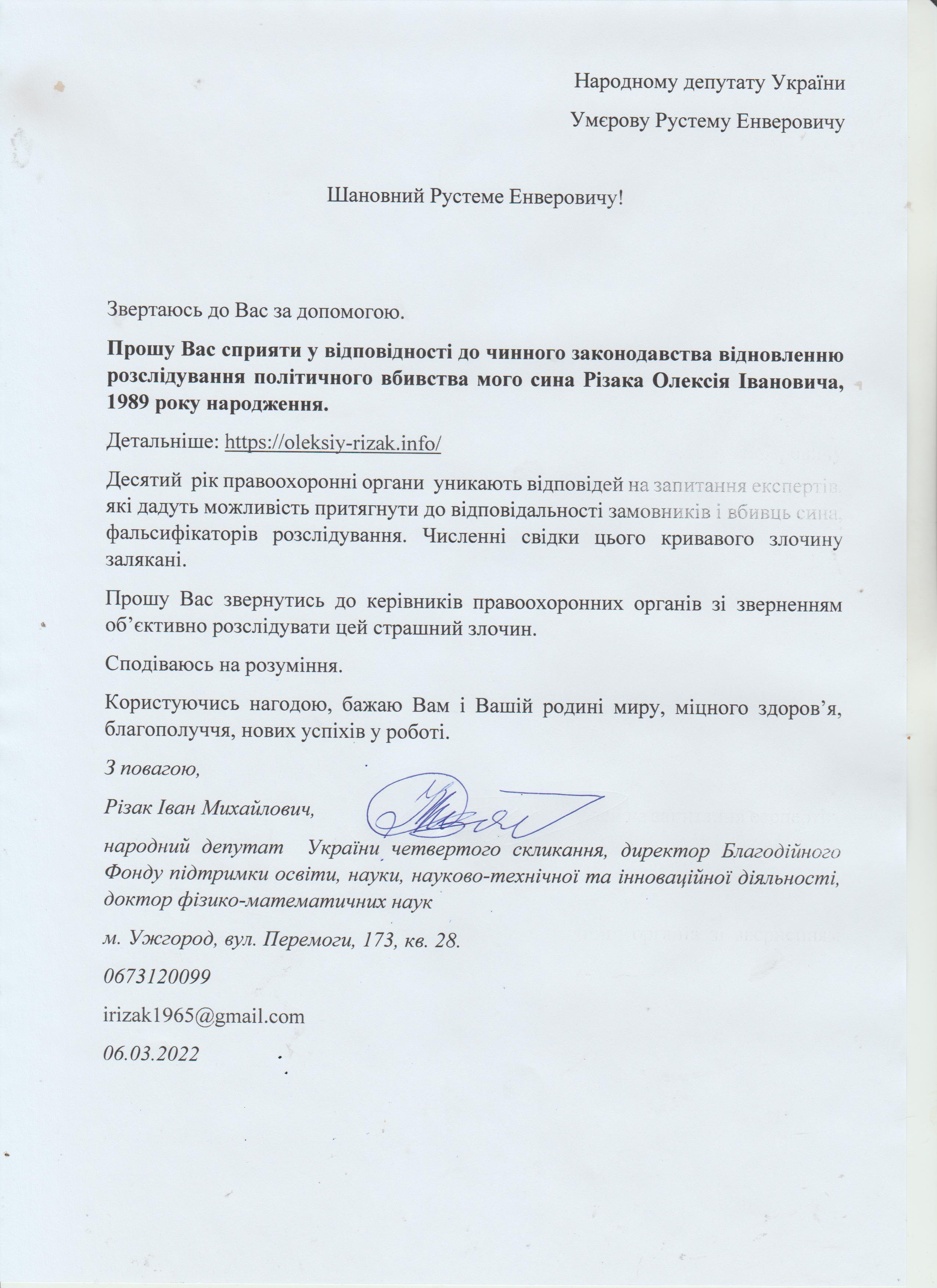 З метою сприяння слідству, а також всебічно об’єктивного розслідування справи прошу Вас доручити своїм підлеглим перевірити наступні питання: 1) чи міг володіти працівник ДПС в Закарпатській області Олексій Різак якоюсь інформацією про тіньовий та кримінальний бізнес в області, знання якої загрожувало б його життю? 2) перевірити у відповідних державних органах наявність у Різака Олексія Івановича та його близьких родичів майна, фінансів, земельних ділянок, підприємств, бізнесу, акцій, облігацій та інших цінних паперів, володіння якими могло б потенційно загрожувати його життю з боку конкурентів та інших співвласників? 3) чи були у нього відносини з громадянкою чи її родичами такими, що могли серйозно впливати на його майновий, матеріальний та ін. стан. 4) чи залучались до спеціальної перевірки, яку потрібно проходити при зарахуванні на державну службу, підрозділи зовнішнього спостереження якоїсь із правоохоронних структур області (я стверджую, що з часу переїзду мене в Закарпаття за нами було встановлене тотальне зовнішнє спостереження)? 5) хотілося б дізнатися (думаю, що це не є слідчою таємницею) в який час і з допомогою якого транспорту 16 листопада 2012 року виїхав син від своєї дівчини, чи проводжала вона його сама або з близькими родичами, чи бачила щось підозріле і яким таксі він виїжджав додому? 6) хотілося б також дізнатися хто першим побачив тіло вбитого юнака і повідомив швидку допомогу і міліцію? 7) з метою перевірки версії спроби отруєння сина Олексія, прошу дати на перевірку у спеціальну токсикологічну лабораторію результати трьох аналізів в «Астра-дія» і одного аналізу, проведеного в кардіодиспансері кілька тижнів тому.