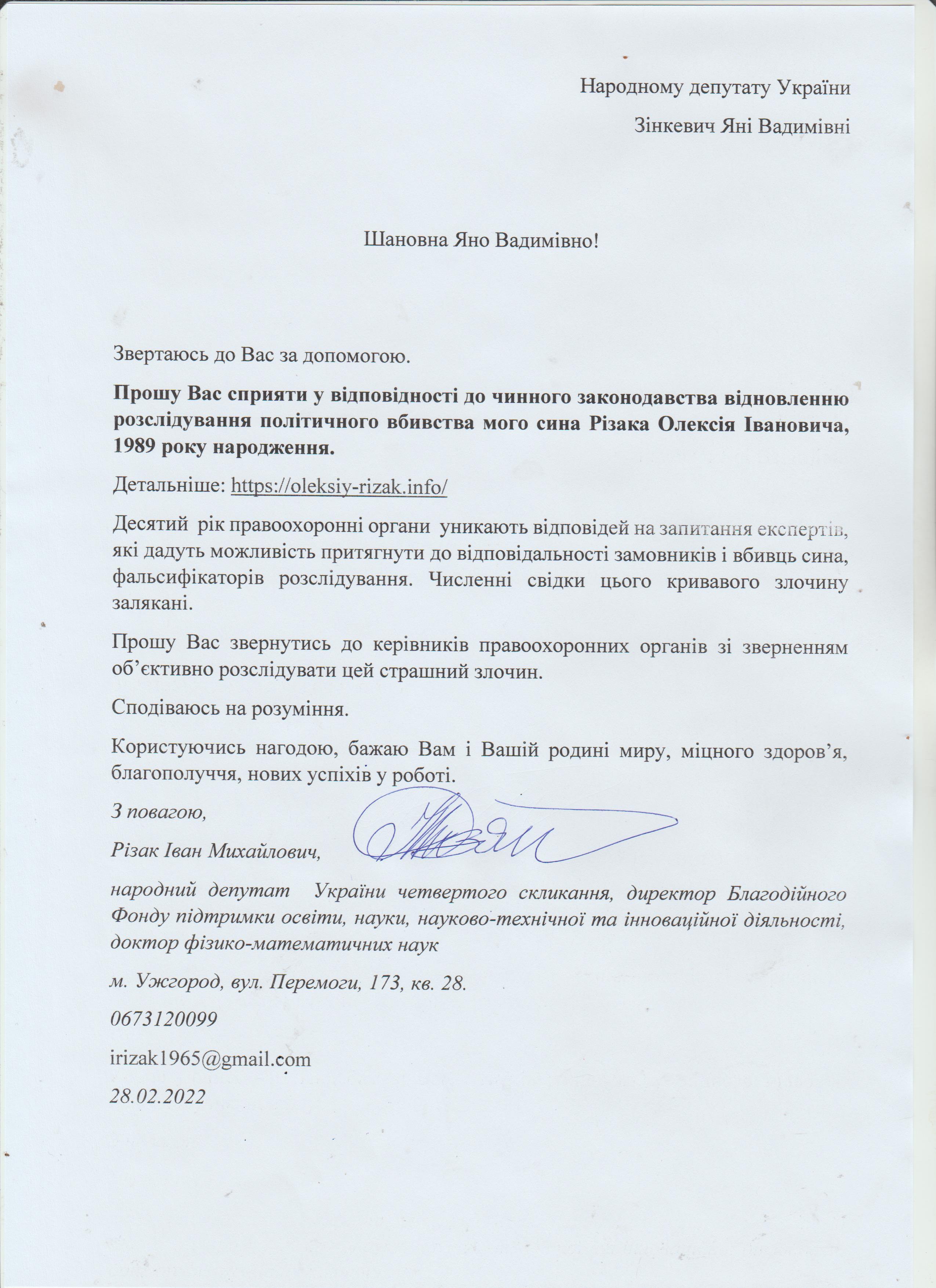 Шановні Анатолію Леонідовичу, Василю Дмитровичу, Василю Миколайовичу! Звертаюся до Вас як батько, як колишній керівник області, як простий житель цього краю, який хоче, щоб на цій землі ніколи не проливалася кров наших рідних, знайомих і близьких. Переконаний, що у політичного керівництва держави є достатньо волі для того, щоб поставити на місце «безпредельщиков», які пробують дестабілізувати ситуацію у державі. Переконаний, що події на кшталт помаранчевого терору у 2005 роців області більше не повторяться. З глибокою повагою, Різак Іван Михайлович, що проживає за адресою м. Ужгород, вул. Капушанська, б.173 кв. 28, голова Закарпатської обласної державної адміністрації (вересень 2002р. – січень 2005р.), народний депутат IV скликання, державний службовець І рангу, багаторічний голова і член координаційного комітету по боротьбі з організованою злочинністю при ОДА, кандидат фізико-математичних наук, тимчасово непрацюючий.