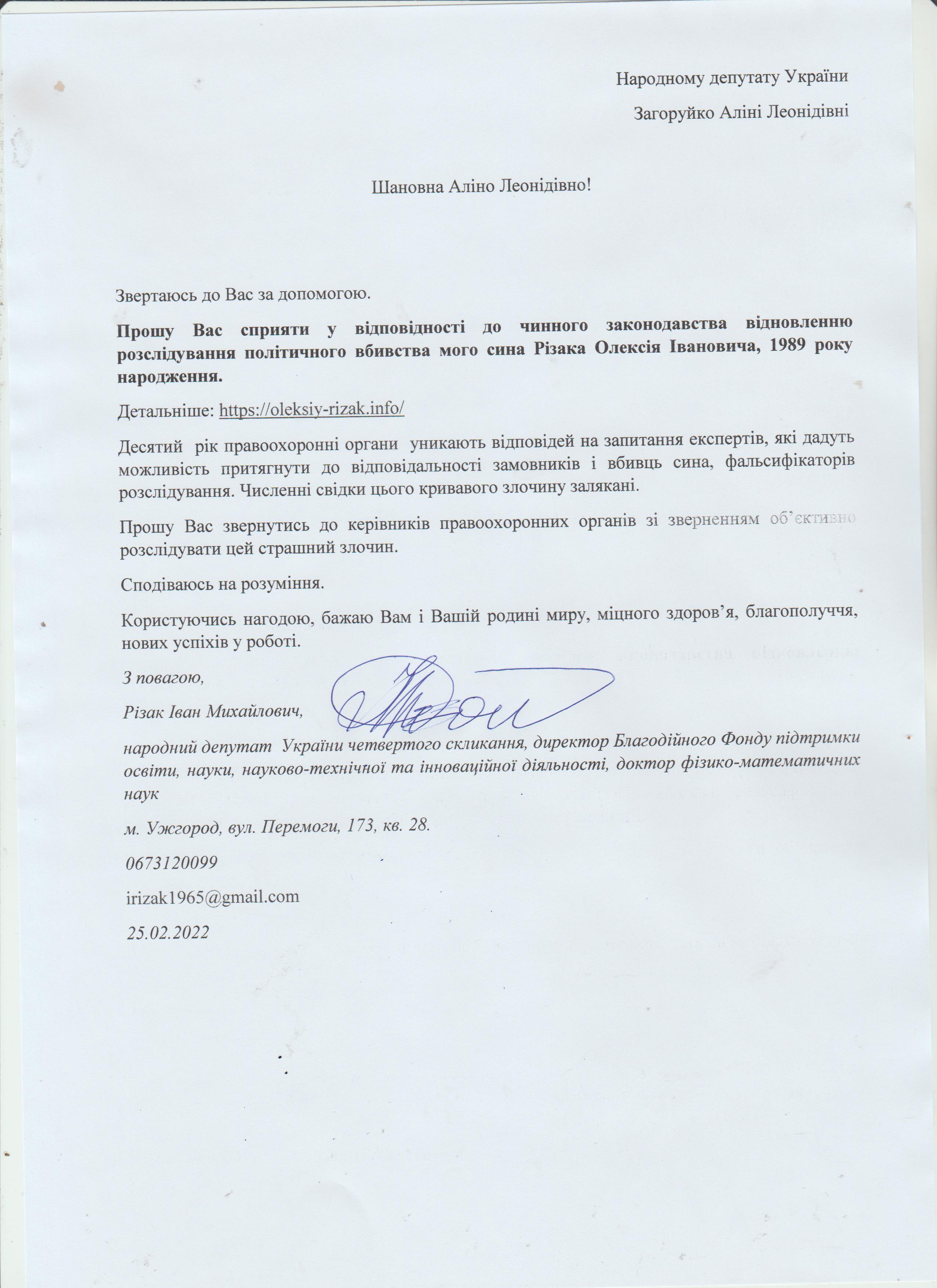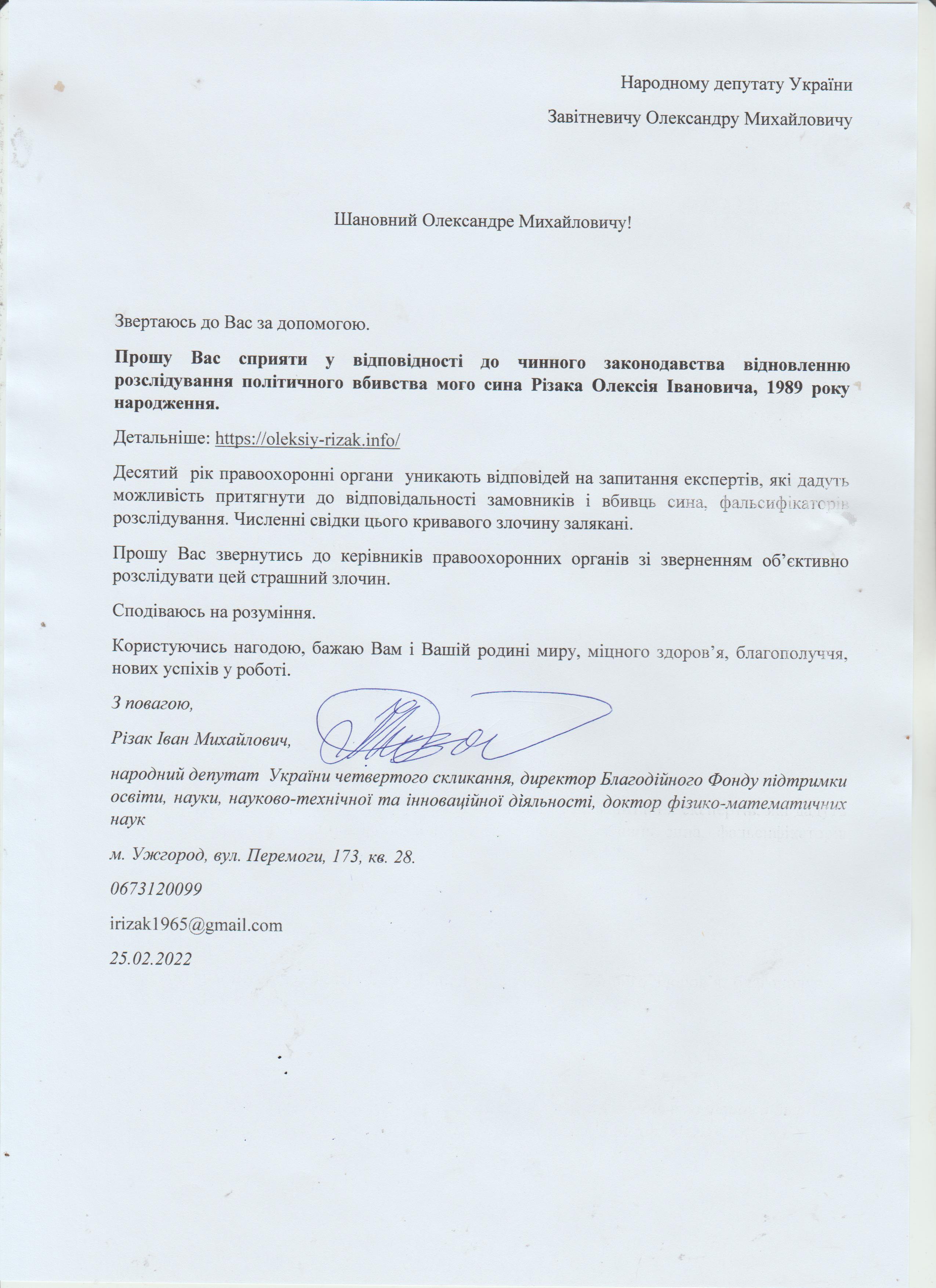 З метою сприяння слідству, а також всебічно об’єктивного розслідування справи прошу Вас доручити своїм підлеглим перевірити наступні питання: 1) чи міг володіти працівник ДПС в Закарпатській області Олексій Різак якоюсь інформацією про тіньовий та кримінальний бізнес в області, знання якої загрожувало б його життю? 2) перевірити у відповідних державних органах наявність у Різака Олексія Івановича та його близьких родичів майна, фінансів, земельних ділянок, підприємств, бізнесу, акцій, облігацій та інших цінних паперів, володіння якими могло б потенційно загрожувати його життю з боку конкурентів та інших співвласників? 3) чи були у нього відносини з громадянкою чи її родичами такими, що могли серйозно впливати на його майновий, матеріальний та ін. стан. 4) чи залучались до спеціальної перевірки, яку потрібно проходити при зарахуванні на державну службу, підрозділи зовнішнього спостереження якоїсь із правоохоронних структур області (я стверджую, що з часу переїзду мене в Закарпаття за нами було встановлене тотальне зовнішнє спостереження)? 5) хотілося б дізнатися (думаю, що це не є слідчою таємницею) в який час і з допомогою якого транспорту 16 листопада 2012 року виїхав син від своєї дівчини, чи проводжала вона його сама або з близькими родичами, чи бачила щось підозріле і яким таксі він виїжджав додому? 6) хотілося б також дізнатися хто першим побачив тіло вбитого юнака і повідомив швидку допомогу і міліцію? 7) з метою перевірки версії спроби отруєння сина Олексія, прошу дати на перевірку у спеціальну токсикологічну лабораторію результати трьох аналізів в «Астра-дія» і одного аналізу, проведеного в кардіодиспансері кілька тижнів тому.
