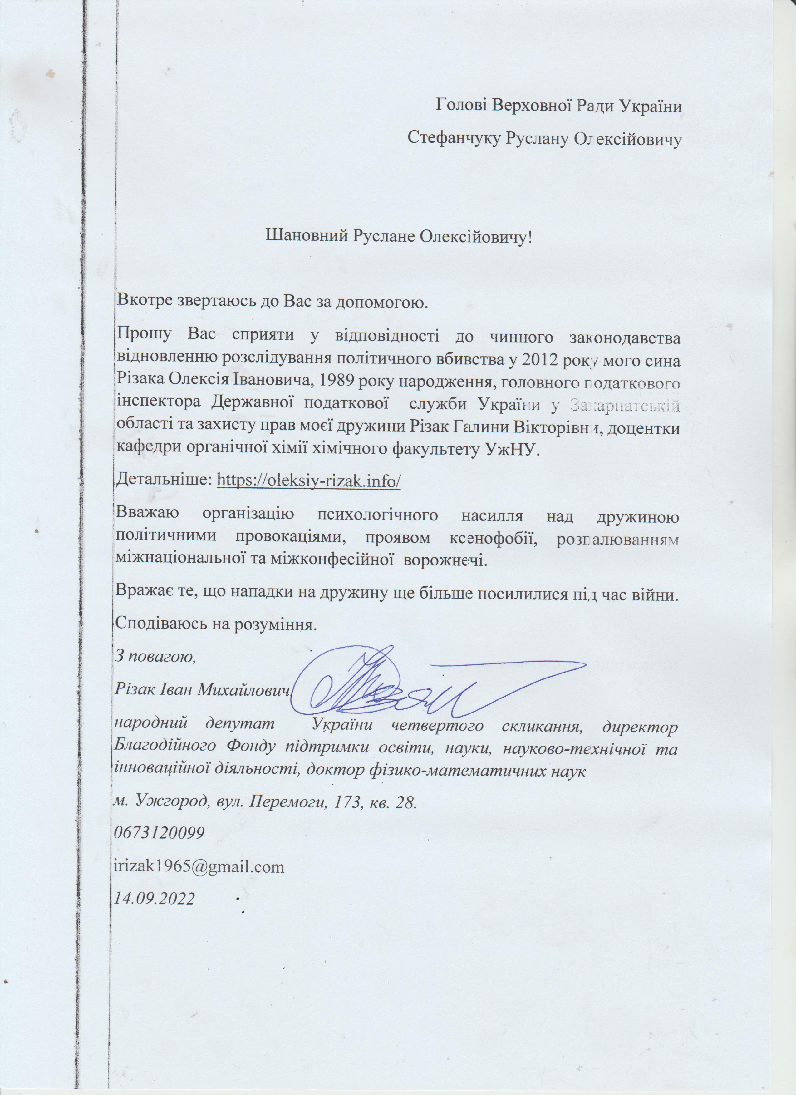 Шановні Анатолію Леонідовичу, Василю Дмитровичу, Василю Миколайовичу! Звертаюся до Вас як батько, як колишній керівник області, як простий житель цього краю, який хоче, щоб на цій землі ніколи не проливалася кров наших рідних, знайомих і близьких. Переконаний, що у політичного керівництва держави є достатньо волі для того, щоб поставити на місце «безпредельщиков», які пробують дестабілізувати ситуацію у державі. Переконаний, що події на кшталт помаранчевого терору у 2005 роців області більше не повторяться. З глибокою повагою, Різак Іван Михайлович, що проживає за адресою м. Ужгород, вул. Капушанська, б.173 кв. 28, голова Закарпатської обласної державної адміністрації (вересень 2002р. – січень 2005р.), народний депутат IV скликання, державний службовець І рангу, багаторічний голова і член координаційного комітету по боротьбі з організованою злочинністю при ОДА, кандидат фізико-математичних наук, тимчасово непрацюючий.