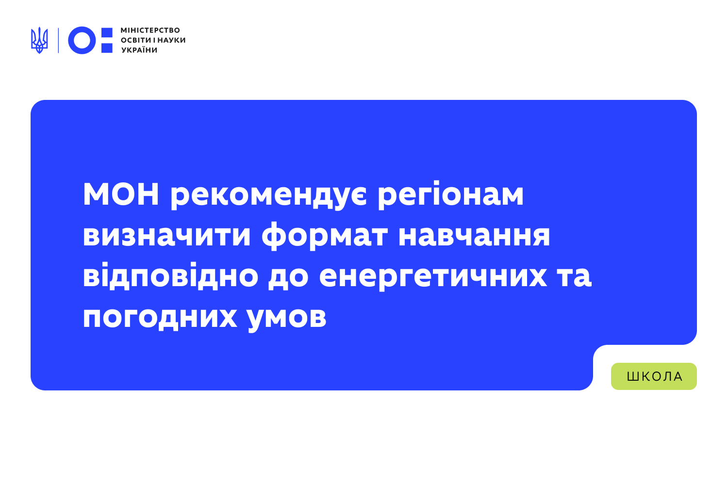 У зв’язку зі складною ситуацією в енергосистемі та погіршенням погодних умов Міністерство освіти і науки України рекомендує обласним і Київській міській державним адміністраціям визначити формат навчання в школах з урахуванням рекомендацій та за участі регіональних комісій з техногенно-екологічної безпеки та надзвичайних ситуацій.