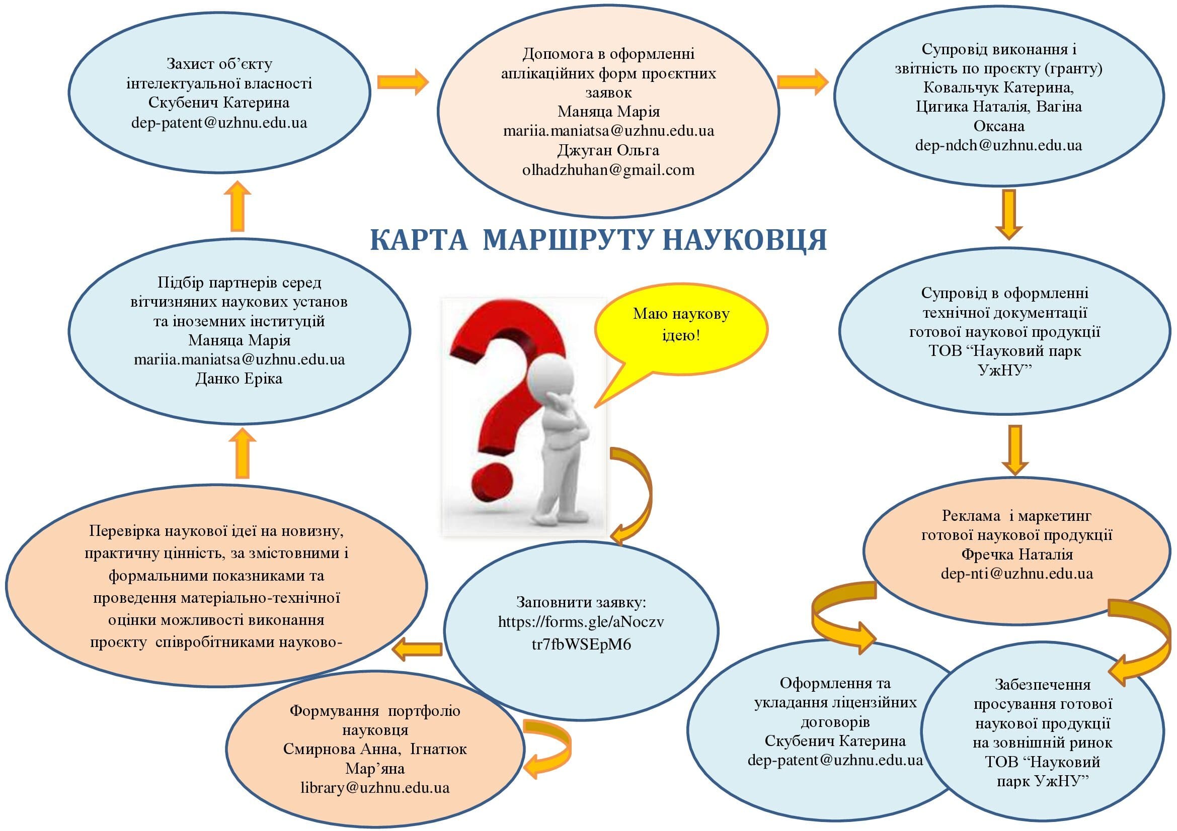 В цій заявці необхідно коротко описати свою ідею. Після того, як ваша заявка пройде перевірку, вам допоможуть працівники різних підрозділів УжНУ.