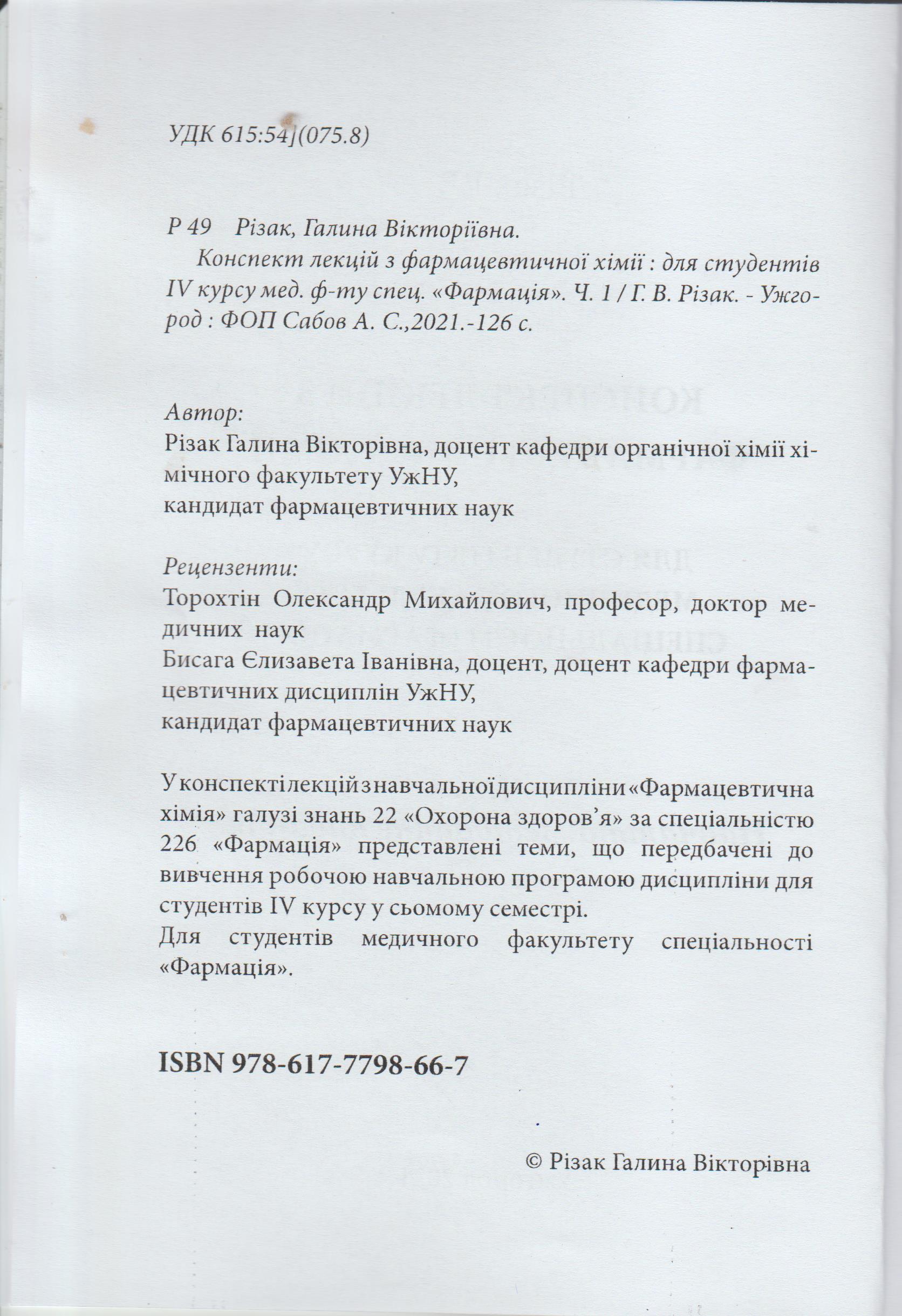 У видавництві "Бреза" вийшло друком начально-методичне видання доцента кафедри органічної хімії, кандидата фармацевтичних наук Галини Різак "Конспект лекцій з фармацевтичної хімії Ч.1." для студентів IV курсу медичного факультету спеціальності "фармація".