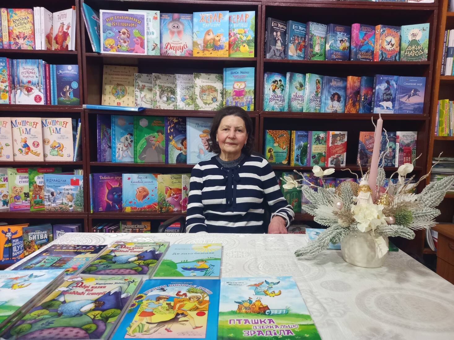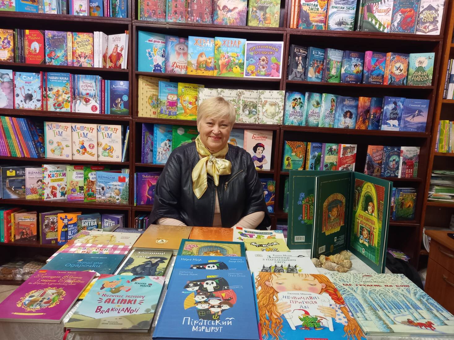 За прилавком письменниця представила чимало книг зі свого доробку, зокрема й уже знакові, люблені читачами «Незвичайні пригоди Алі» (вивчають у 5 класі), «Піратський маршрут» (увійшла до списку найкращих книг світу «Білі круки») «Злочинці з паралельного світу», «Їде грудень на коні».