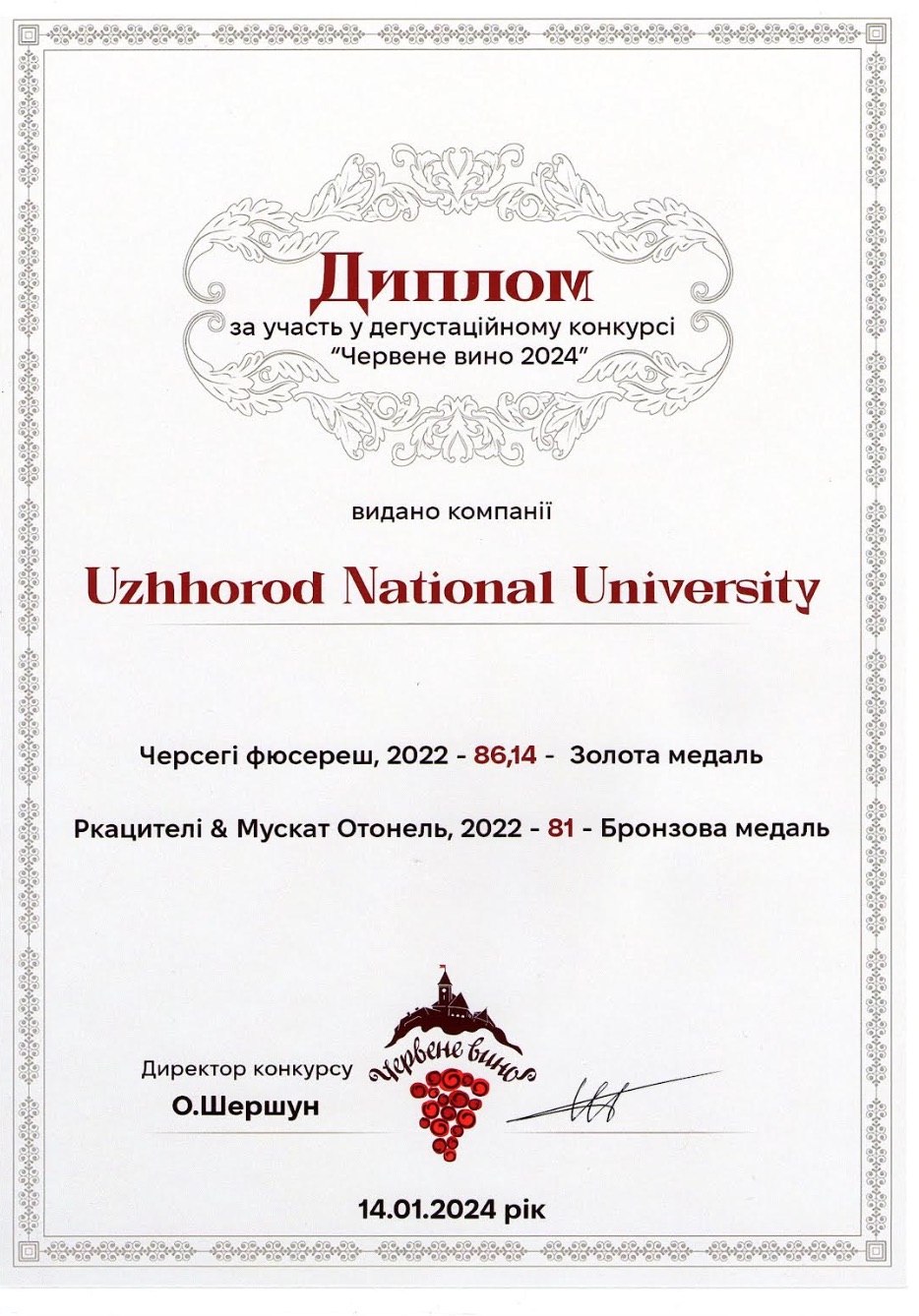 Кафедра Плодоовочівництва і виноградарства біологічного факультету УжНУ дебютно представила два взірці вина 2022 року виробництва, а саме: Черсегі Фюсереш та купаж двох сортів Ркацителі і Мускат Оттонель.