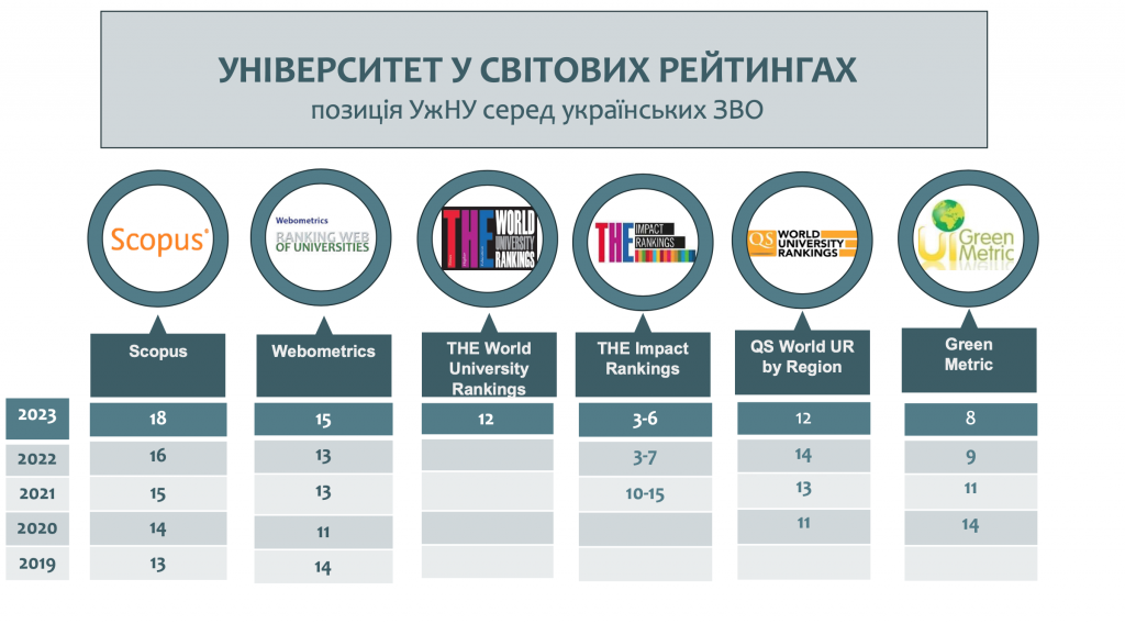 Як зазначив ректор УжНУ Володимир Смоланка на Конференції трудового колективу УжНУ, університет посідає провідні позиції серед українських університетів за іншими міжнародними рейтингами: 12 місце – у QS World University Rankings: EECA, 8 місце – у GreenMetric World University Rankings, 15 місце – у рейтингу Webometrics, 18– у SciVerse Scopus.