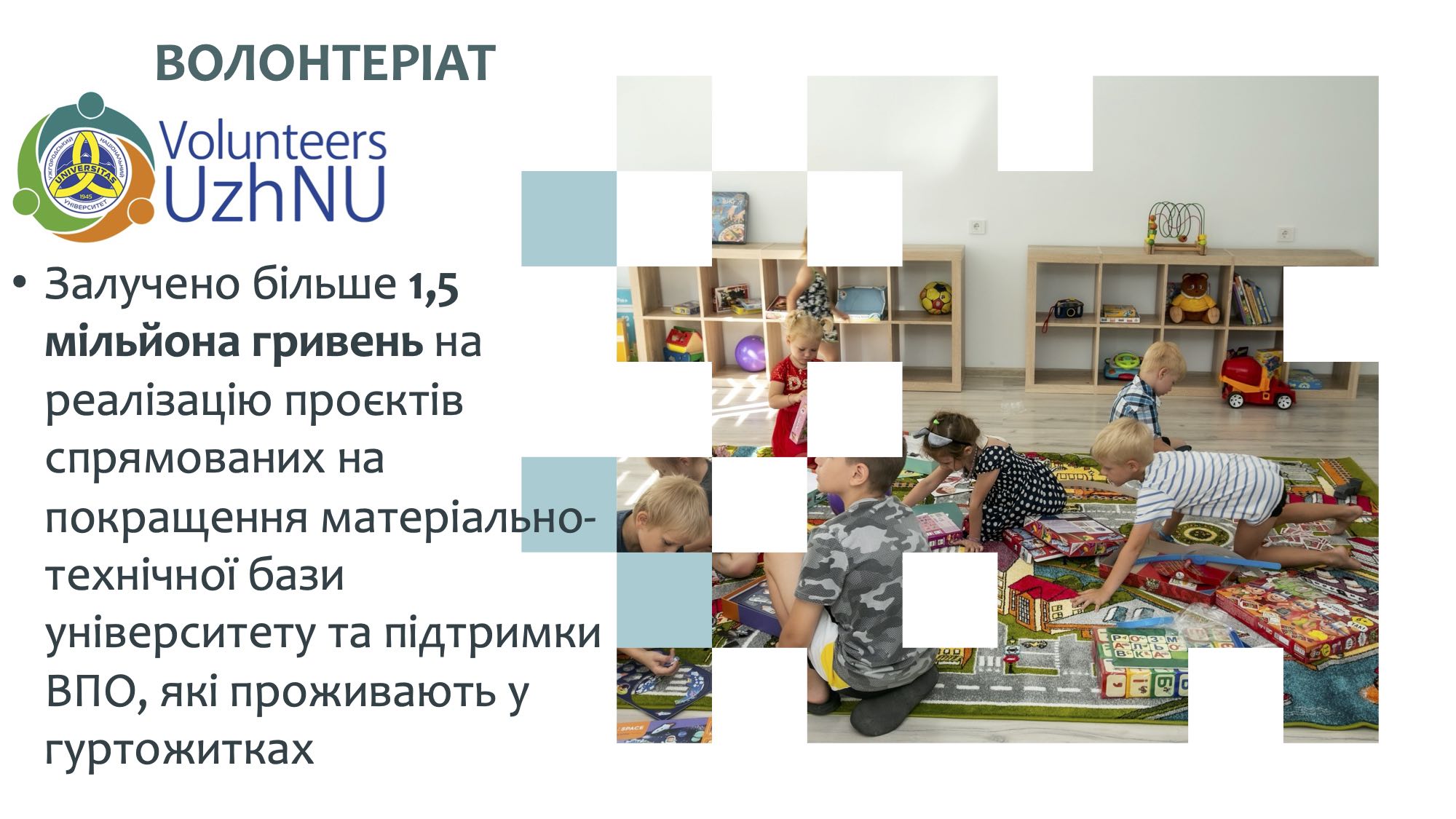 За підтримки Благодійного фонду «Жовто блакитні крила» було створено «Коворкінг-простір для розвитку психосоціальних навичок у внутрішньо- переміщених діток з тимчасово окупованих регіонів України та міст де відбуваються активні військові дії». Відремонтовано та облаштовано приміщення на базі університетського гуртожитку, де проживають внутрішньо переміщені дітки та студенти з окупованих територій. Важливою складовою діяльності Волонтеріату є допомога ЗСУ. Завдяки власним зусиллям (організація благодійних концертів, виставок, ярмарок ітд.), нашим закордонним партнерам, громадським організаціям Karpatská nadácia, Podaj dalej (Словаччина), Kárpátok alapítvány (Угорщина) та волонтерам з Бельгії, Нідерландів, Угорщини, Словаччини, Румунії та інших країн вдається забезпечувати бійців кількох підрозділів маскувальними та протидроновими сітками, генераторами, спальниками, наметами, мастилом, а завдяки Словацькій асоціації ковалів на передову потрапляють такі необхідні там скоби для зведення бліндажів, інструменти, печі-буржуйки.