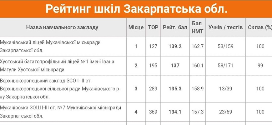 Одразу чотири шкіл Мукачева потрапили до цього рейтингу, при цьому Мукачівський ліцей – перший у списку.