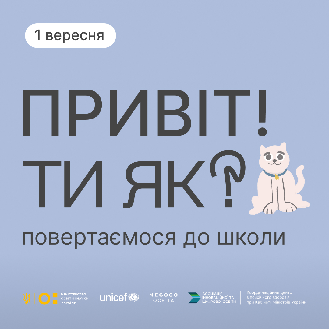 Міністерство освіти і науки України спільно з Всеукраїнською програмою ментального здоров’я «Ти як?», ініційованої першою леді України Оленою Зеленською, та Дитячим фондом ООН (ЮНІСЕФ) в Україні розробили урок «ТИ ЯК? Повертаємось до школи!» до старту нового навчального року 2023-2024.