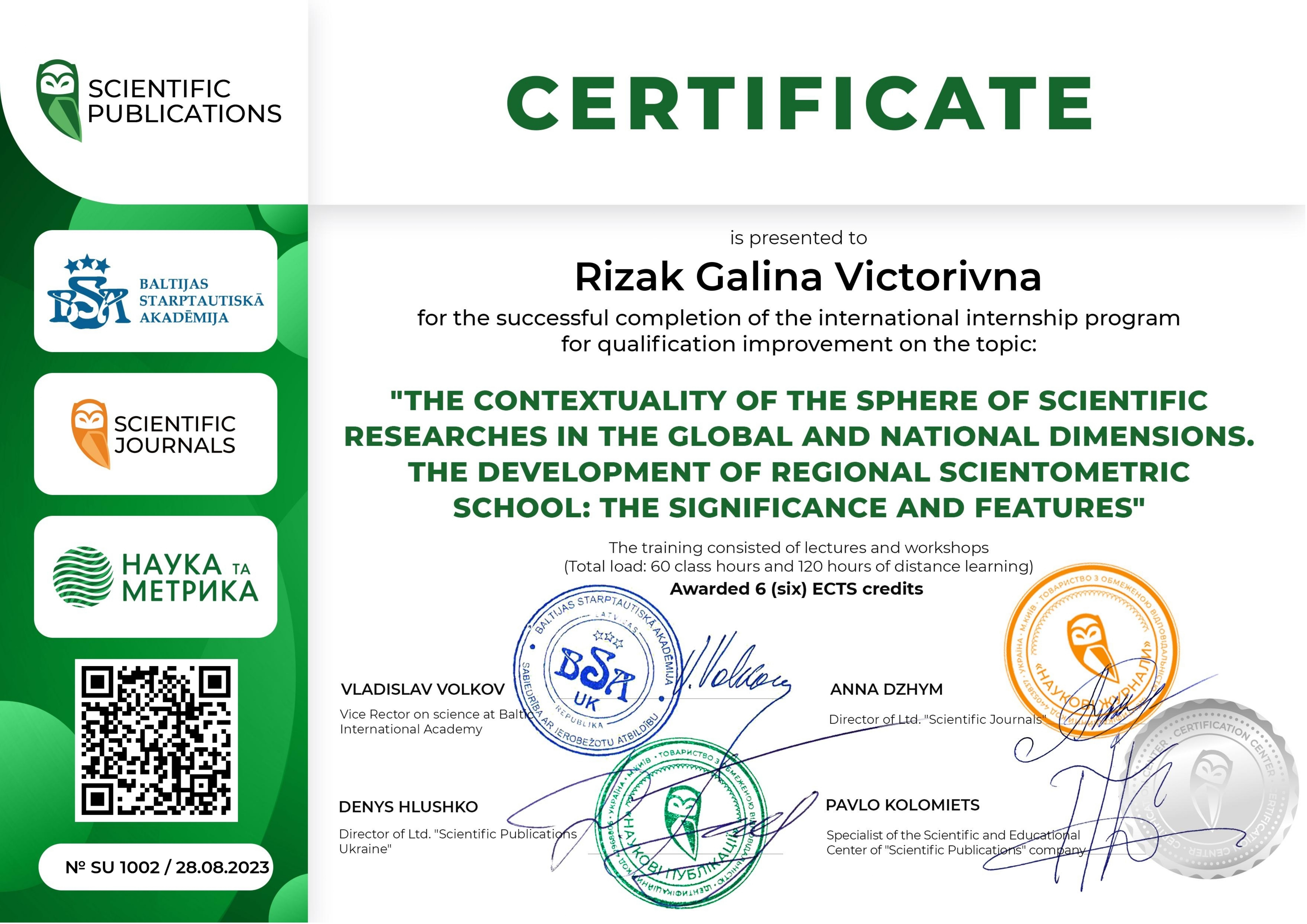 «Створення інноваційних освітніх програм в Україні: досвід і рекомендації країн ЄС» - так називається стаття. яку Галина Вікторівна Різак опублікувала разом з колегами з інших вузів статтю в одному з найавторитетніших фахових журналів «Академічні візії».