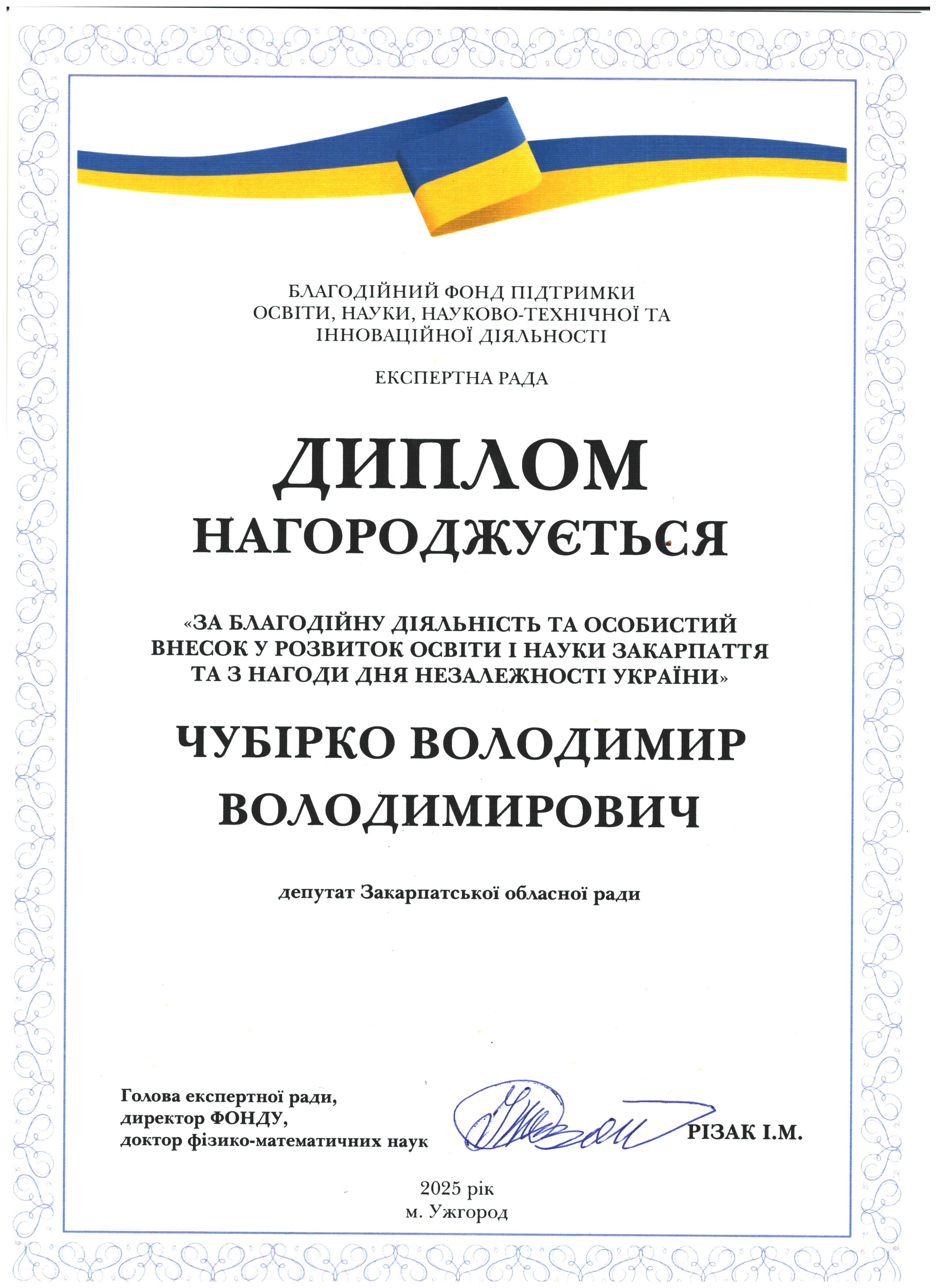 Дякуємо Володимиру Володимировичу Чубірку за підтримку освіти і науки Закарпаття!
