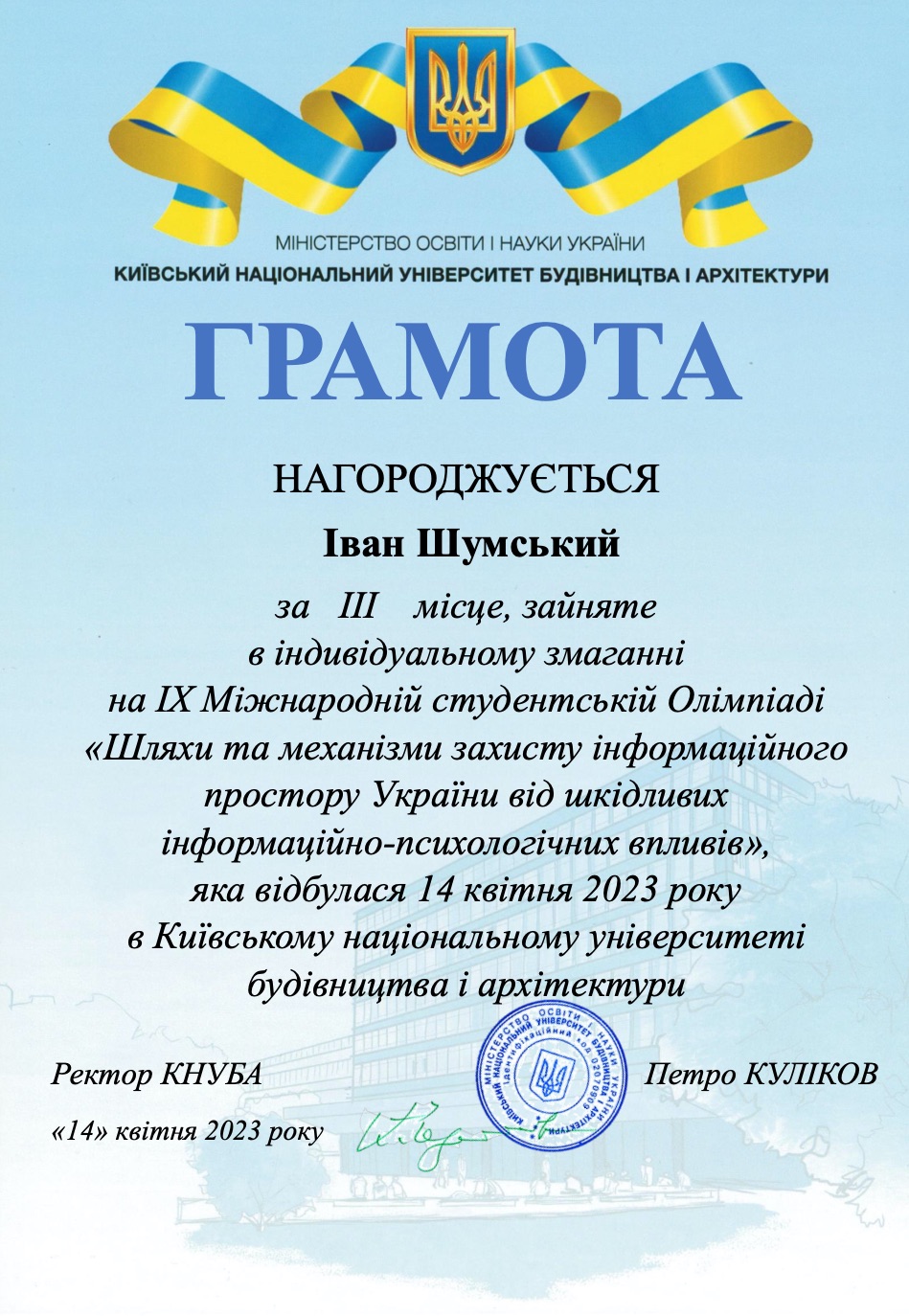14 квітня 2023 року, на базі Київського Національного університету архітектури і будівництва відбулась IX Міжнародна олімпіада «Шляхи та механізми захисту інформаційного простору України від шкідливих інформаційно-психологічних впливів».