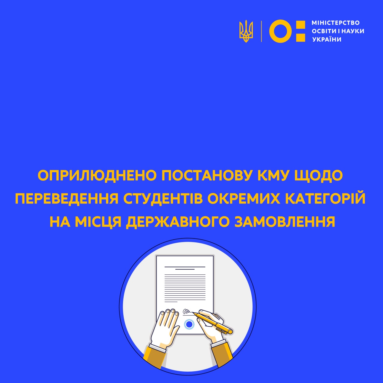 Автор фото – пресслужба Міністерства освіти і науки України На урядовому порталі оприлюднено постанову КМУ від 28 жовтня 2022 р. № 1224 «Про затвердження Порядку переведення на навчання за державним замовленням окремих категорій здобувачів фахової передвищої, вищої освіти, які зараховані до закладів фахової передвищої, вищої освіти до 2021 року включно на місця, що фінансуються за кошти фізичних та/або юридичних осіб». До цих категорій студентів належать: діти загиблих захисників України: діти (особи у віці до 23 років) загиблих (померлих) осіб, зазначених у статті 101 Закону України «Про статус ветеранів війни, гарантії їхнього соціального захисту» (категорія 1); учасники бойових дій та особи з інвалідністю внаслідок війни: особи, визнані учасниками бойових дій, особами з інвалідністю внаслідок війни відповідно до Закону України «Про статус ветеранів війни, гарантії їхнього соціального захисту» (категорія 2); діти учасників бойових дій: діти (особи у віці до 23 років) учасників бойових дій, осіб з інвалідністю внаслідок війни відповідно до Закону України «Про статус ветеранів війни, гарантії їхнього соціального захисту» (категорія 3); жителі особливо небезпечних територій: особи, які проживають на (перемістилися з) тимчасово окупованій Російською Федерацією території України в умовах воєнного стану, на території територіальних громад, що розташовані в районі проведення воєнних (бойових) дій або які перебувають в тимчасовій окупації, оточенні (блокуванні) на території територіальних громад, що станом на 15 жовтня та 15 лютого відповідного року внесені до переліку, затвердженого Мінреінтеграції (категорія 4).