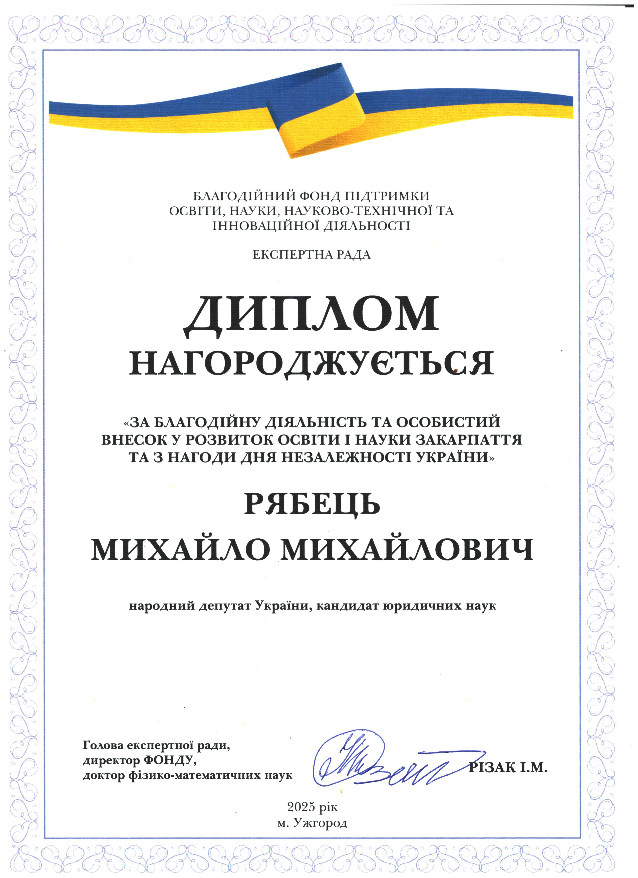 Дякуємо Михайлу Михайловичу Рябцю за підтримку освіти і науки Закарпаття!