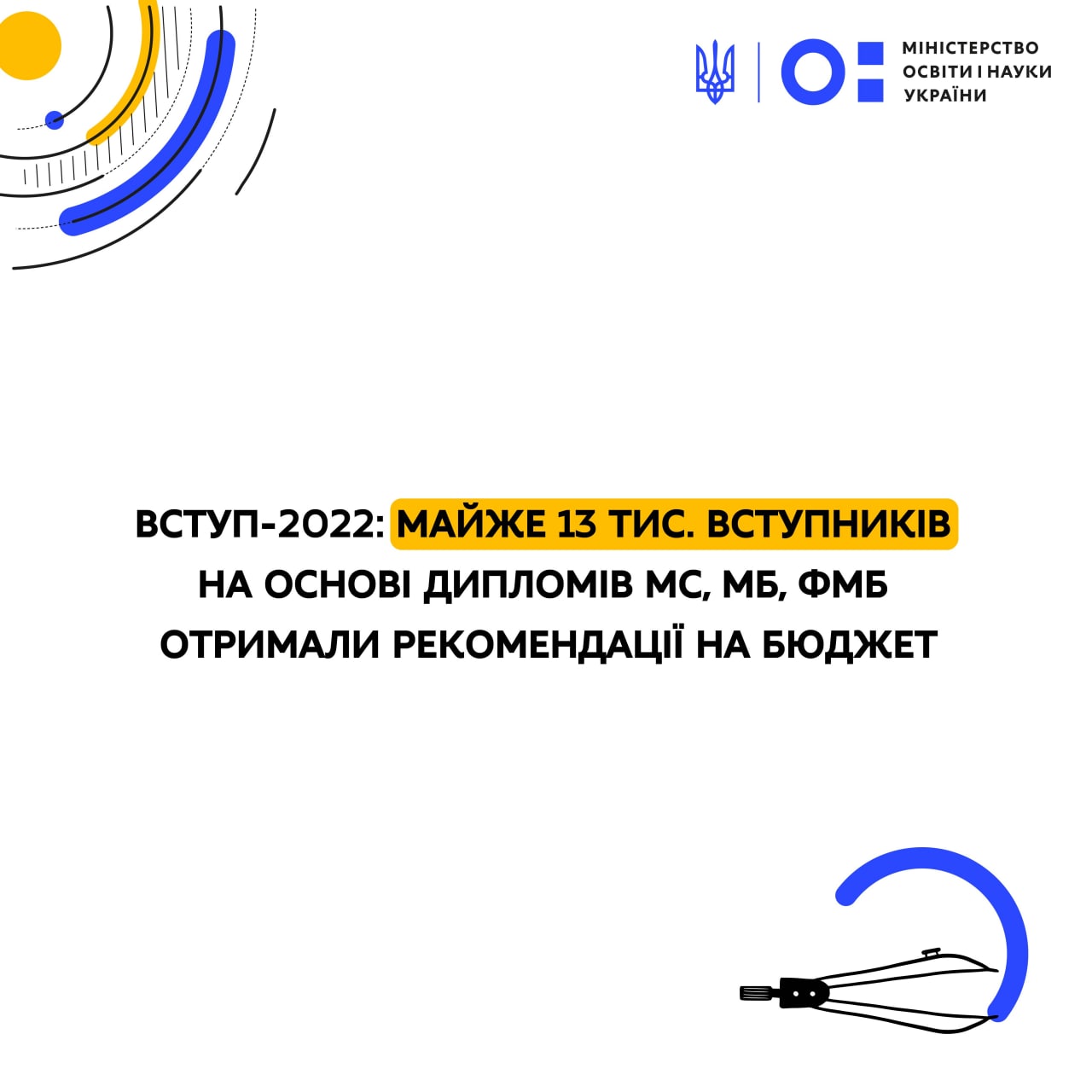 2 вересня 2022 року майже 13 тис. вступників до ЗВО на основі дипломів молодшого спеціаліста, молодшого бакалавра, фахового молодшого бакалавра отримали рекомендації на бюджет.