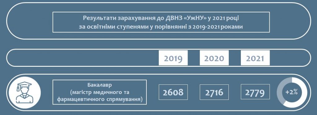 У 2021 році до УжНУ було подано 14995. Загалом, вступна каманія-2021 виявилась для університету успішнішою за минулорічну – у 2020 році УжНУ отримав від вступників 14724 заяв, у тому числі на основі повної середньої освіти 11 410 заяв на противагу 12 248 заявам у 2021 році. В Ужгородському національному університеті реалізуються 206 освітніх програм на першому (бакалаврському), другому (магістерському) та третьому (освітньо-науковому) рівнях вищої освіти та 7 освітніх програм фахової передвищої освіти у Природничо-гуманітарному фаховому коледжі університету.
