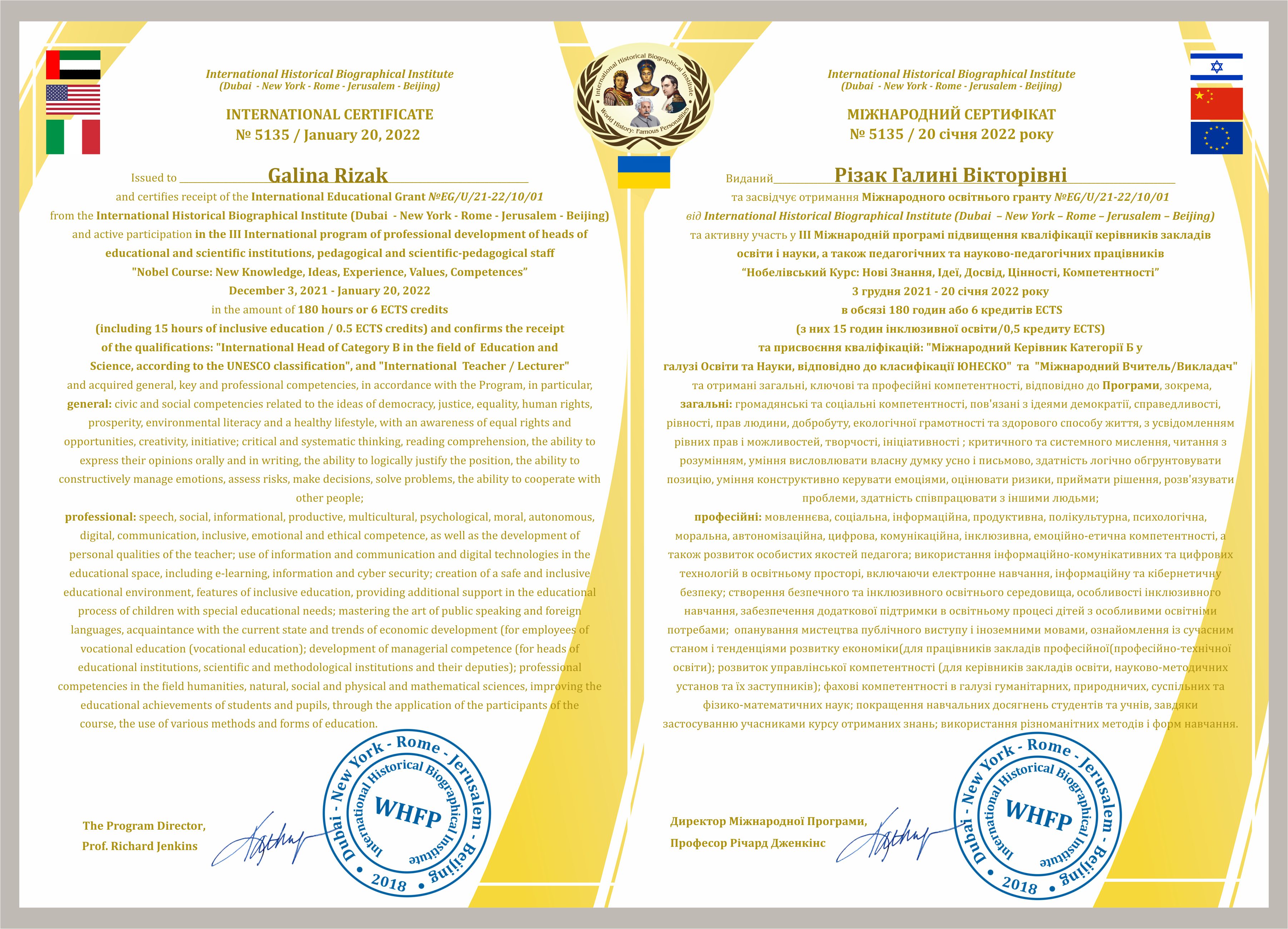 Програма надзвичайно цікава. The International Historical Biographical Institute (Dubai ¬ - New York – Rome – Jerusalem - Beijing) реалізував проект, який не має аналогів.