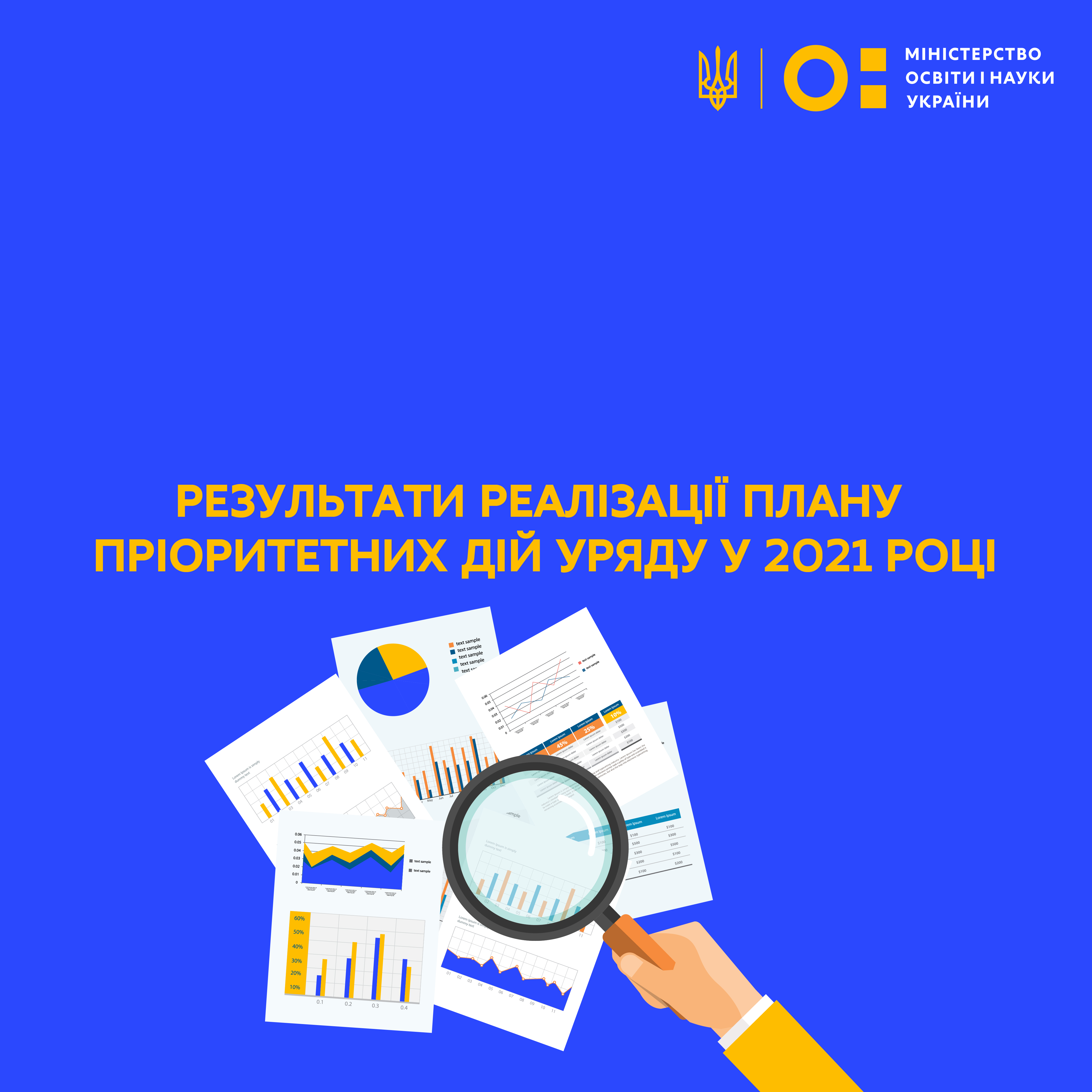 За результатами реалізації Плану пріоритетних дій Уряду, станом на 31 грудня 2021 року в повному обсязі Міністерством освіти і науки було виконано 41 крок, а також виконується ще 23. Усього було передбачено виконання 377 заходів, з них Міністерству освіти і науки вдалося успішно реалізувати 298.