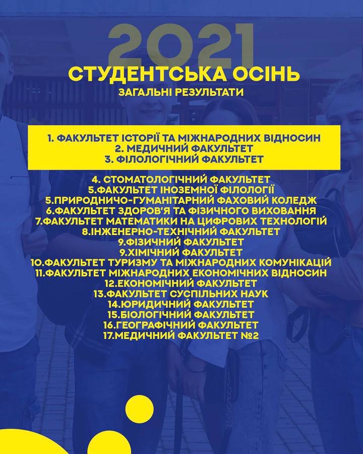 Максимально факультет міг заробити 50 балів в одній номінації. А також своїми вподобайками учасників оцінювали користувачі соцмереж і визначали приз глядацьких симпатій».