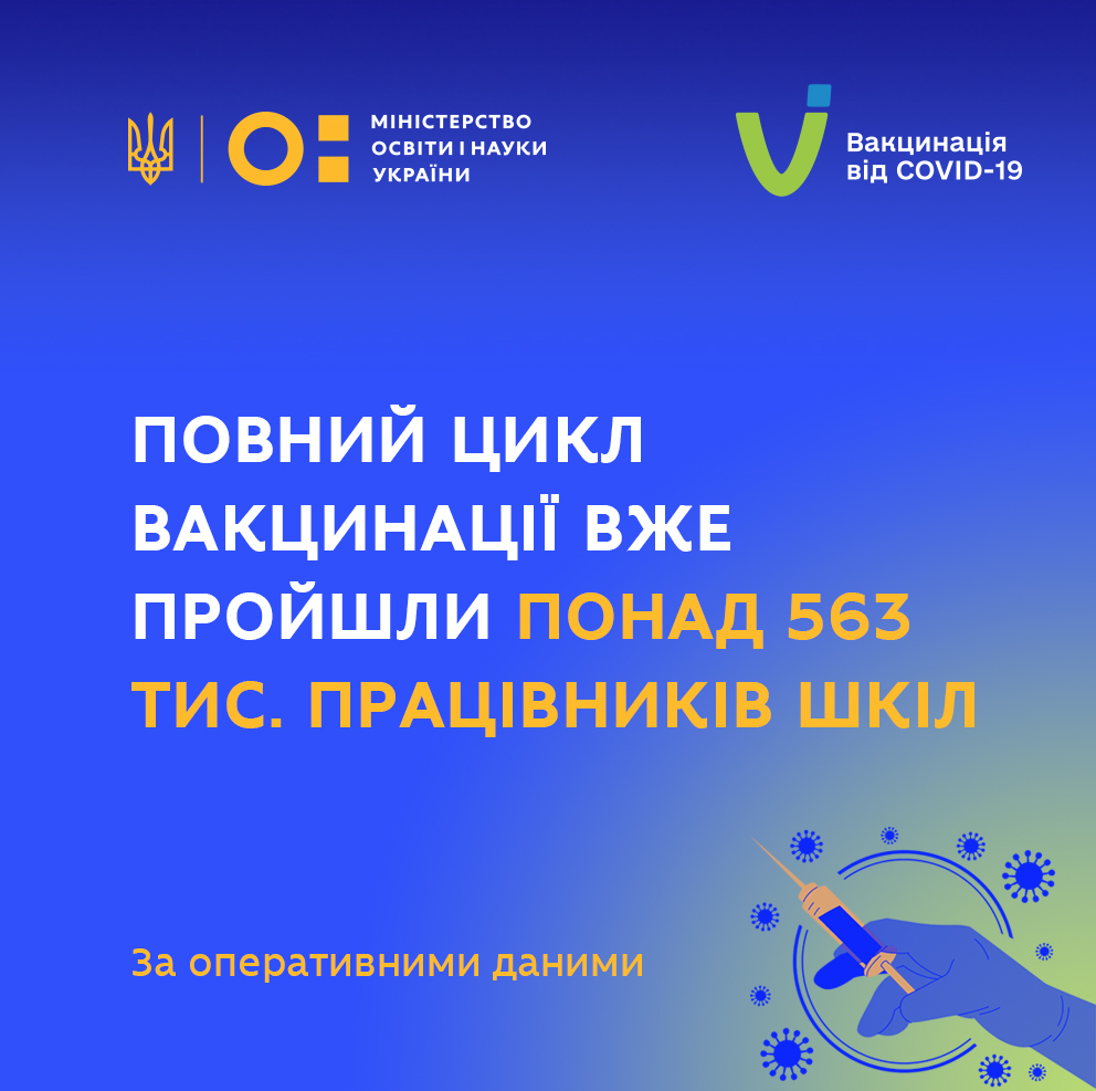 “Принаймні однією дозою вакциновано 96,5% працівників закладів загальної середньої освіти, з них повний цикл вакцинації вже пройшли понад 563 тис., або 86,4% від загальної кількості (22 листопада було 84,5%)”, – зазначив Сергій Шкарлет.
