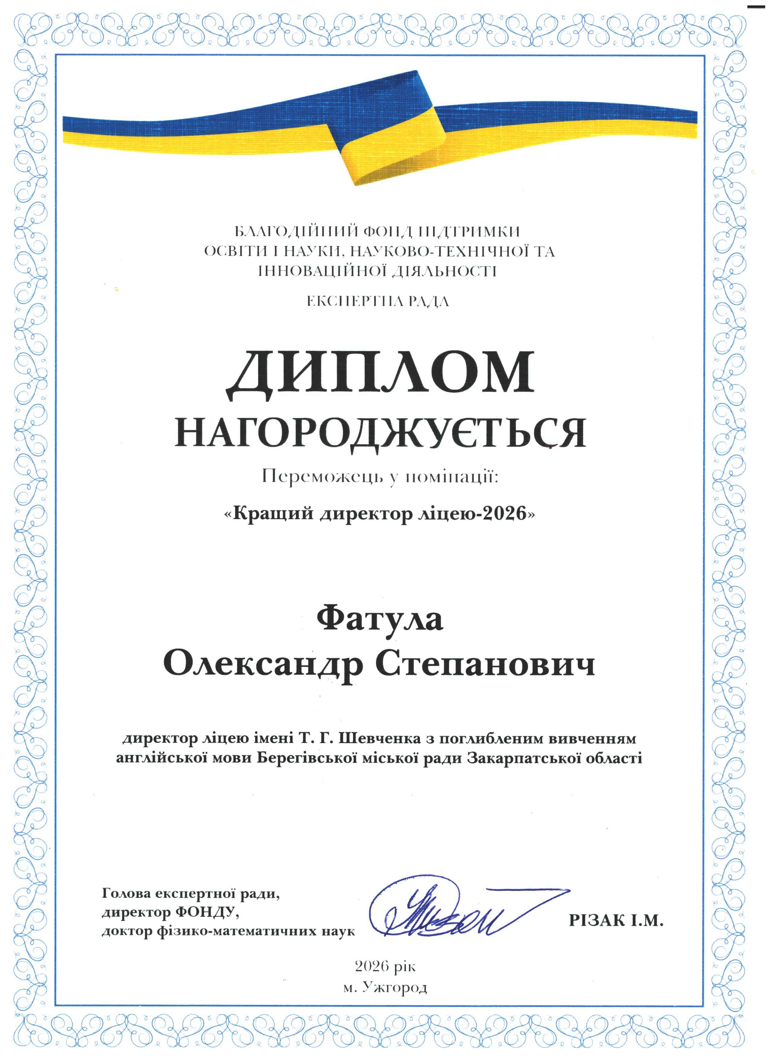 Вітаємо Олександра Степановича Фатулу з перемогою у номінації "Кращий директор ліцею -2026"