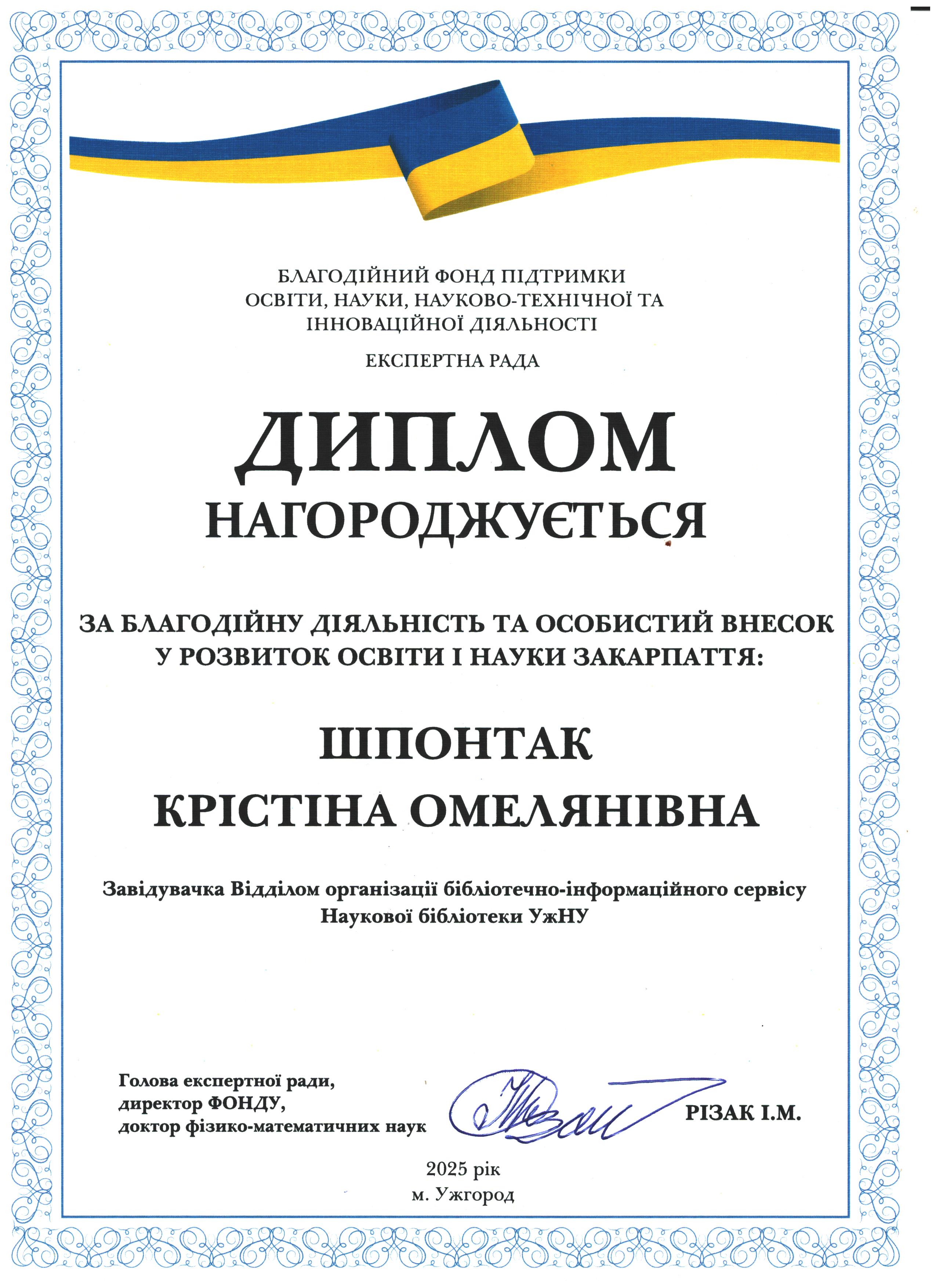 Дякуємо Крістіні Омелянівні Шпонтак за допомогу у розвитку науки та освіти Закарпаття!