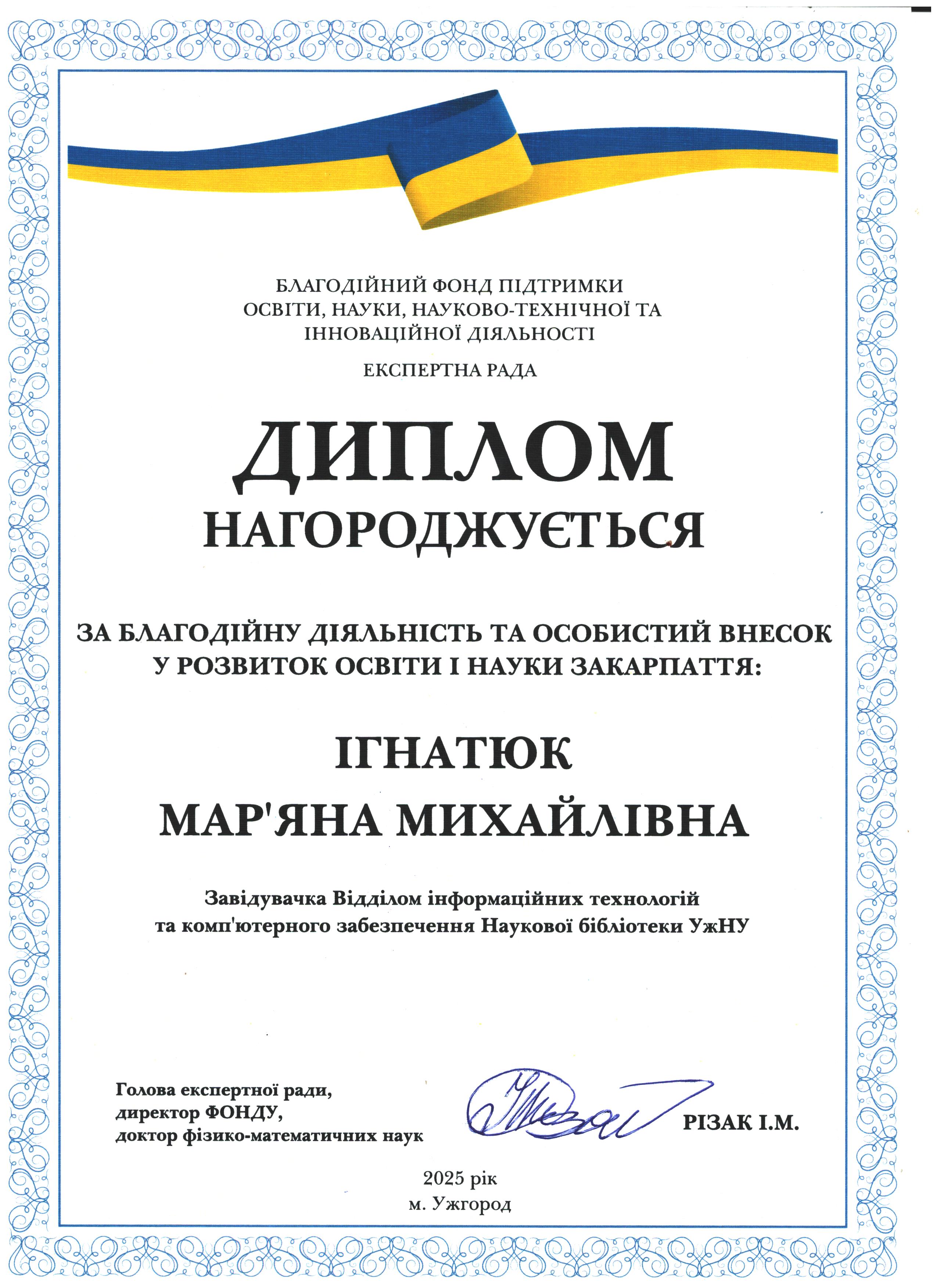 Дякуємо Мар'яні Михайлівні Ігнатюк за допомогу у розвитку науки та освіти Закарпаття!